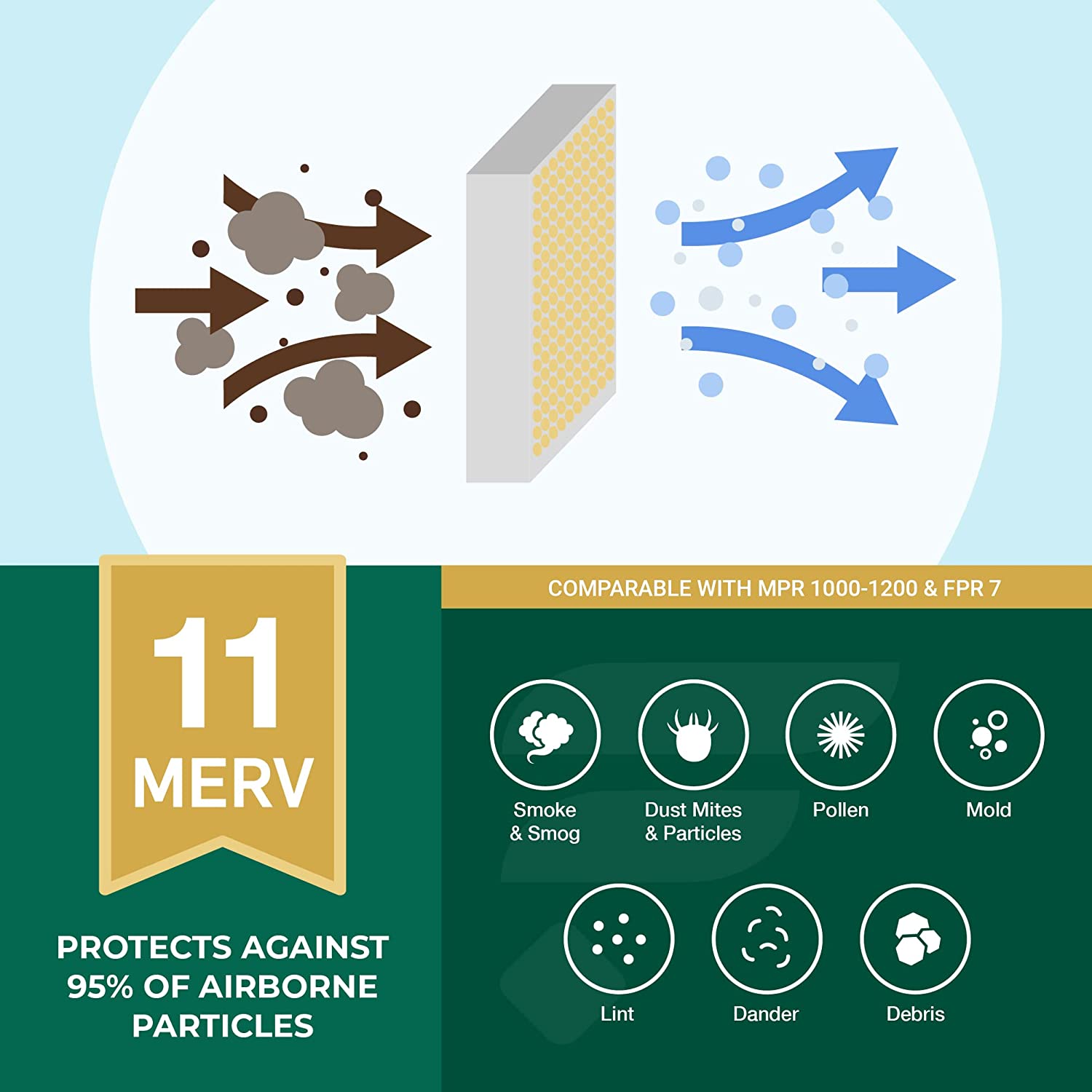 - MERV 11 electrostatic media (MPR 1200, FPR 7) protects against 95% of particles