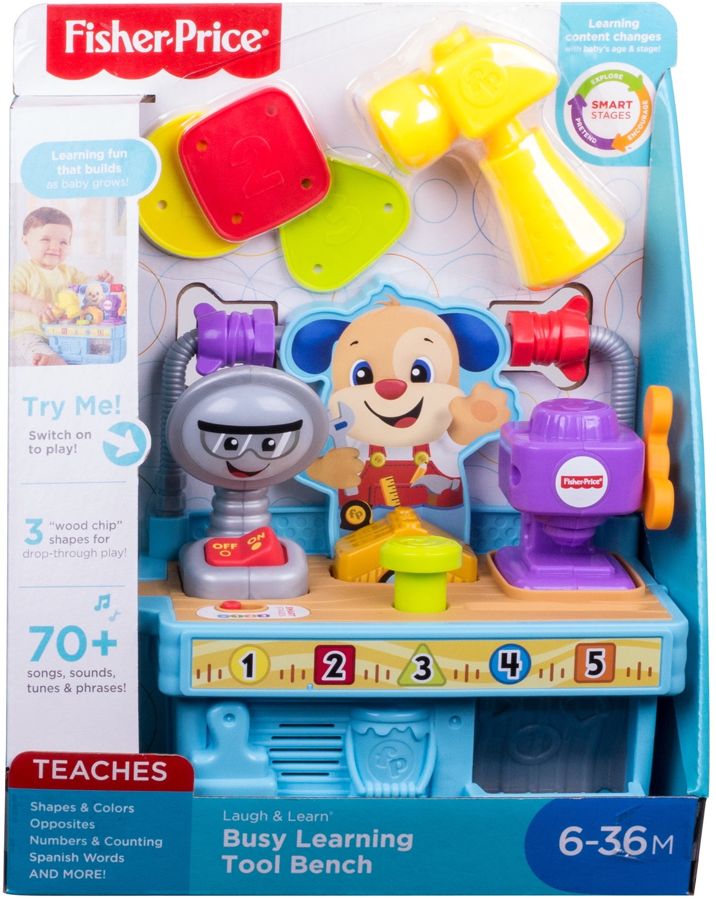 The Laugh & Learn Busy Learning Tool Bench from Fisher-Price has all the right tools for learning and role-play fun! As your little builder hammers, drills, and toggles the switch, playful songs, phrases and sounds introduce numbers, colors, the alphabet, Spanish words, and more. Plus, with Smart Stages technology, the learning fun builds as your baby grows!