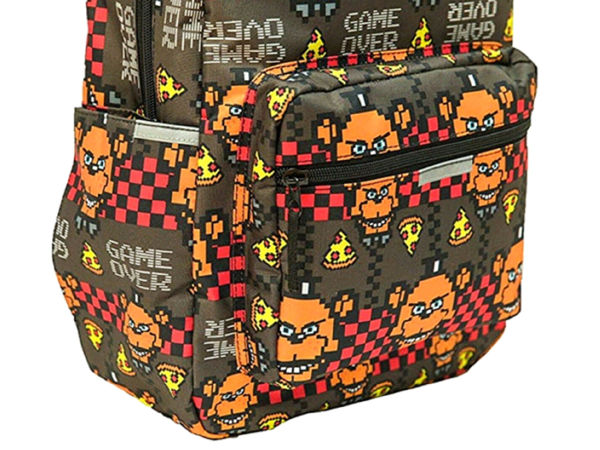 Five Nights at Freddy’s All Over PrintBackpack, School Book Bag, All over game over character graphics. Backpack has one large compartment with interior laptop sleeve and front pocket with zipper closure. Adjustable padded shoulder straps and loop for hanging. Side beverage pocket. Backpack measures 17 inches by 12 inchesGraphics feature Freddy Fazbear, Pizza and "GAME OVER"