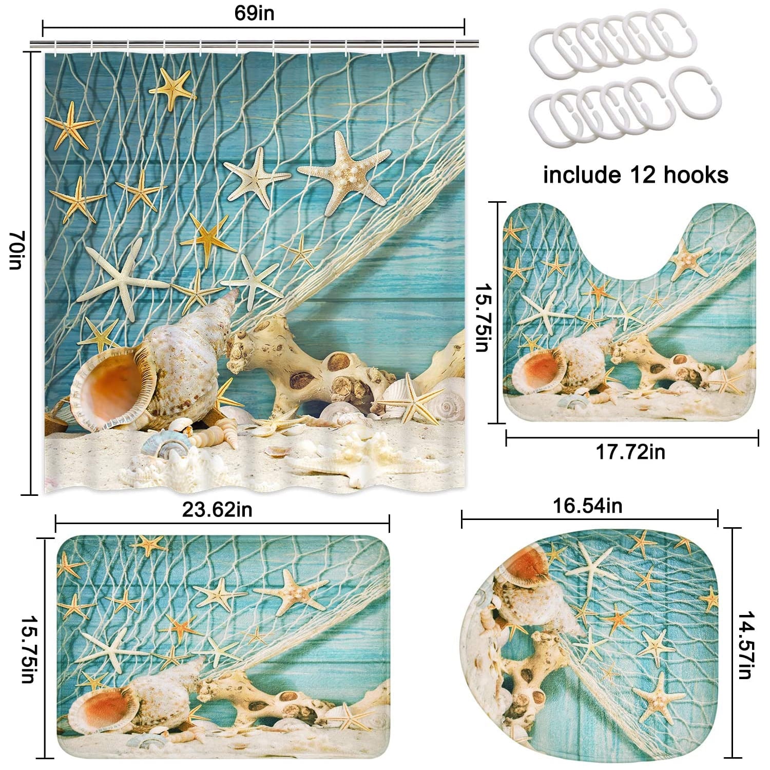 FRAMICS gold seashell starfish conch teal ocean nautical pattern shower curtain set is made of eco-friendly polyester, has a good waterproof effect. FRAMICS gold seashell starfish conch teal ocean nautical pattern non-slip bath mat/U type rug made from flannel, durable, non-toxic.