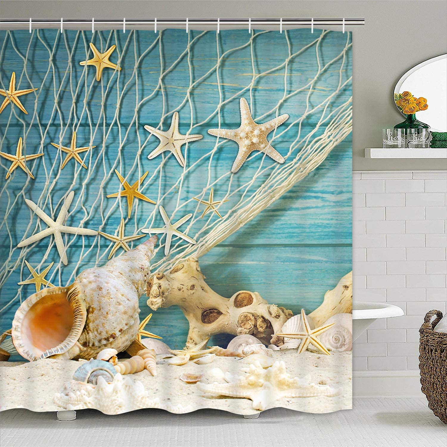FRAMICS gold seashell starfish conch teal ocean nautical pattern shower curtain set with new and fashion design, perfect for bathroom decor, provide both privacy and decorative appeal at the same time.