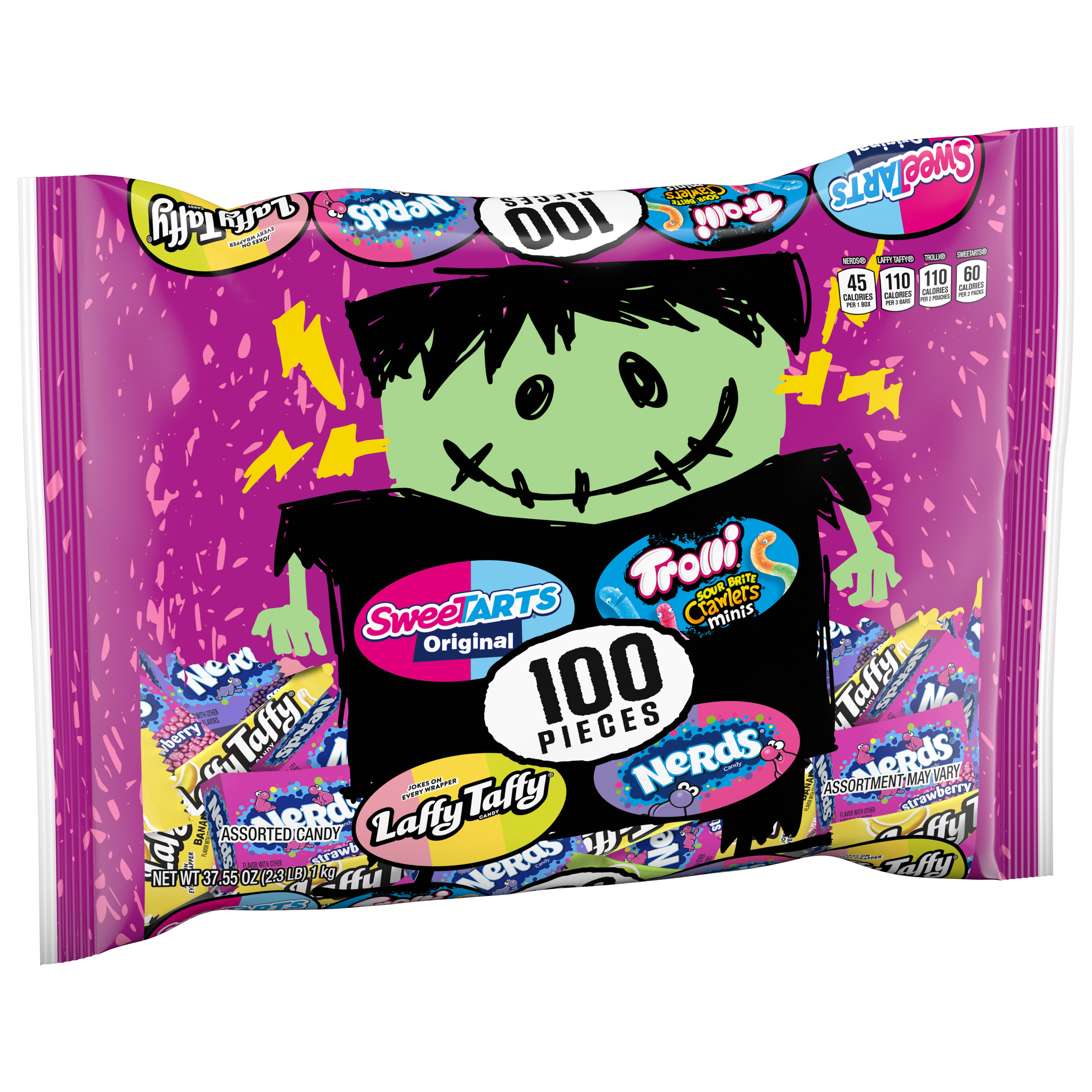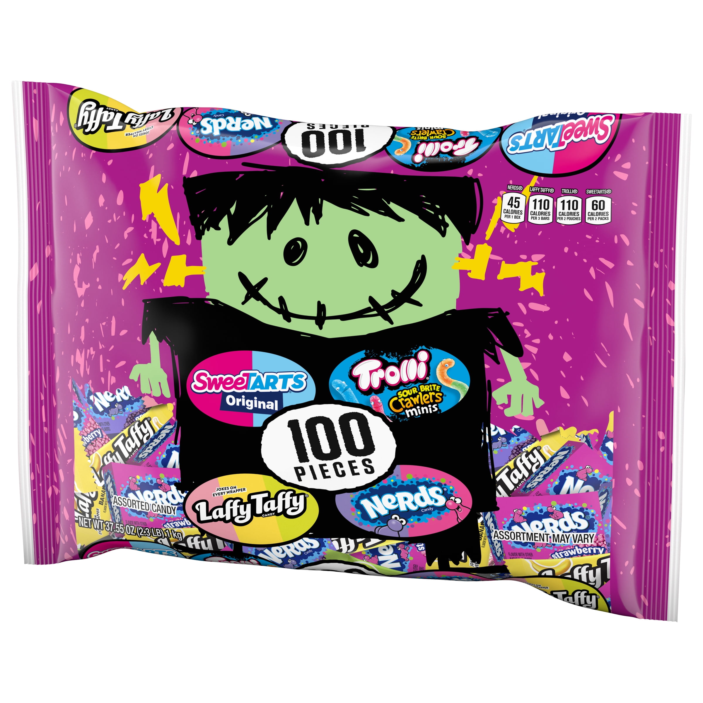 Sweeten the season with a freaky mix of Frankenstein’s favorite treats! Each bag contains 100 individually wrapped pieces of fan-favorite candies, including SweeTARTS Originals, Trolli Sour Brite Crawlers Minis, Laffy Taffy, and NERDS Originals. This assorted candy variety pack is your best bet for an easy way to fill candy bags for partygoers, both young and old. These individually wrapped snacks can be used as goodie bag stuffers or for Halloween candy bags.