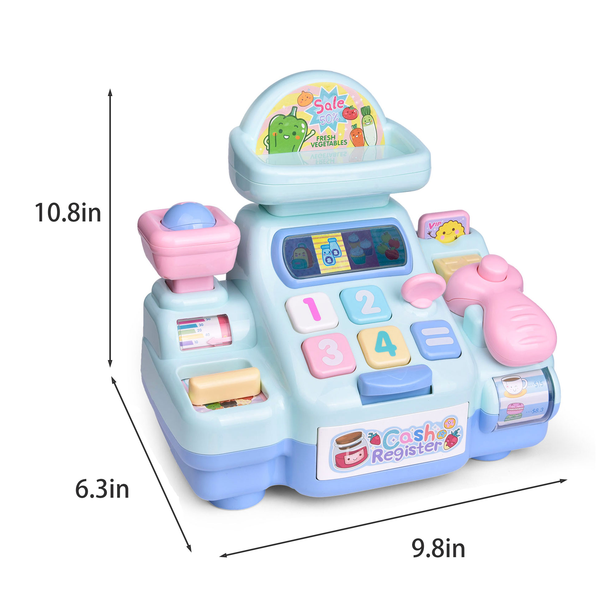- Cash register measures 9.84’’L by 6.3’’W by 10.8’’H; requires 3 AA batteries