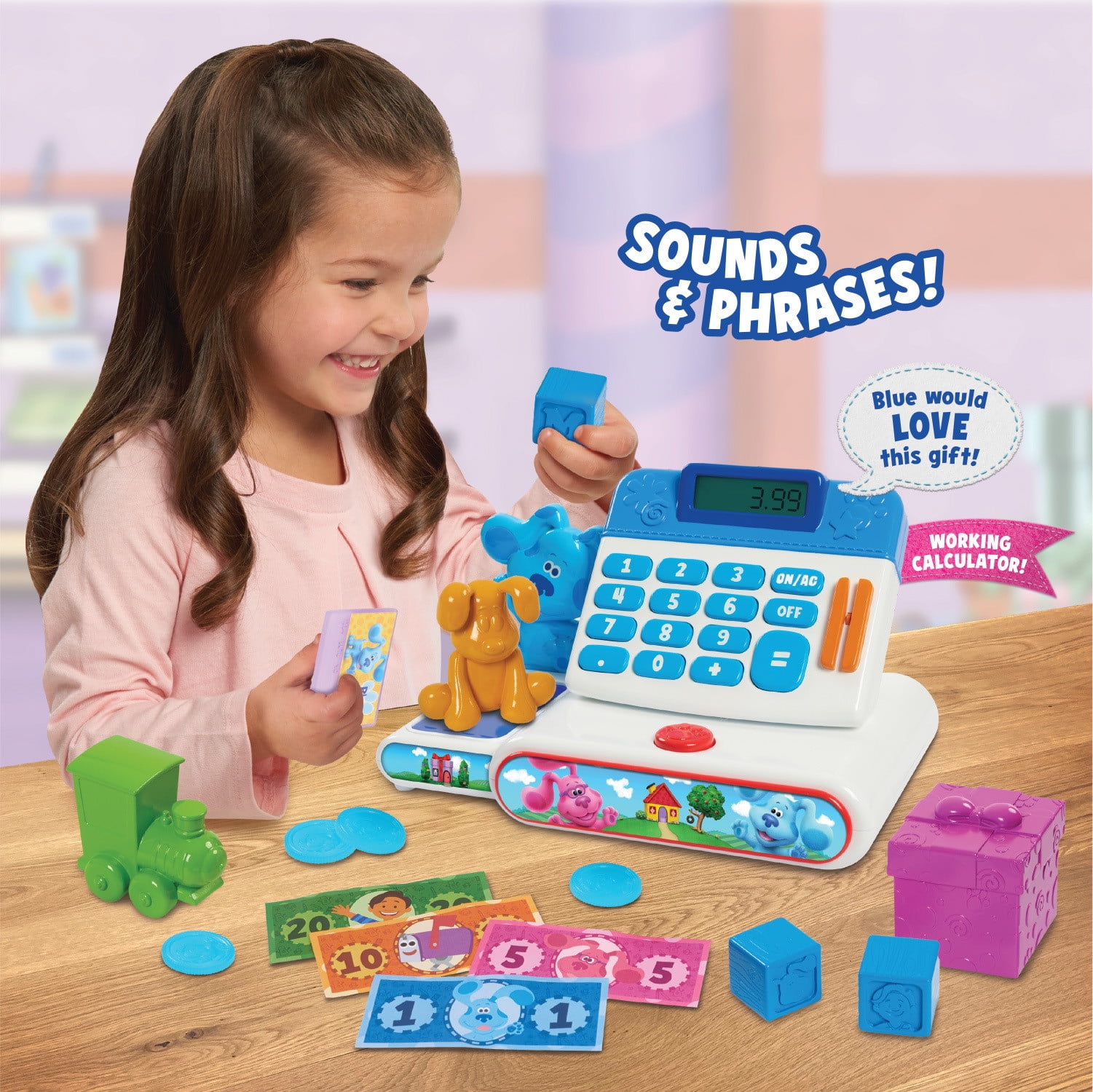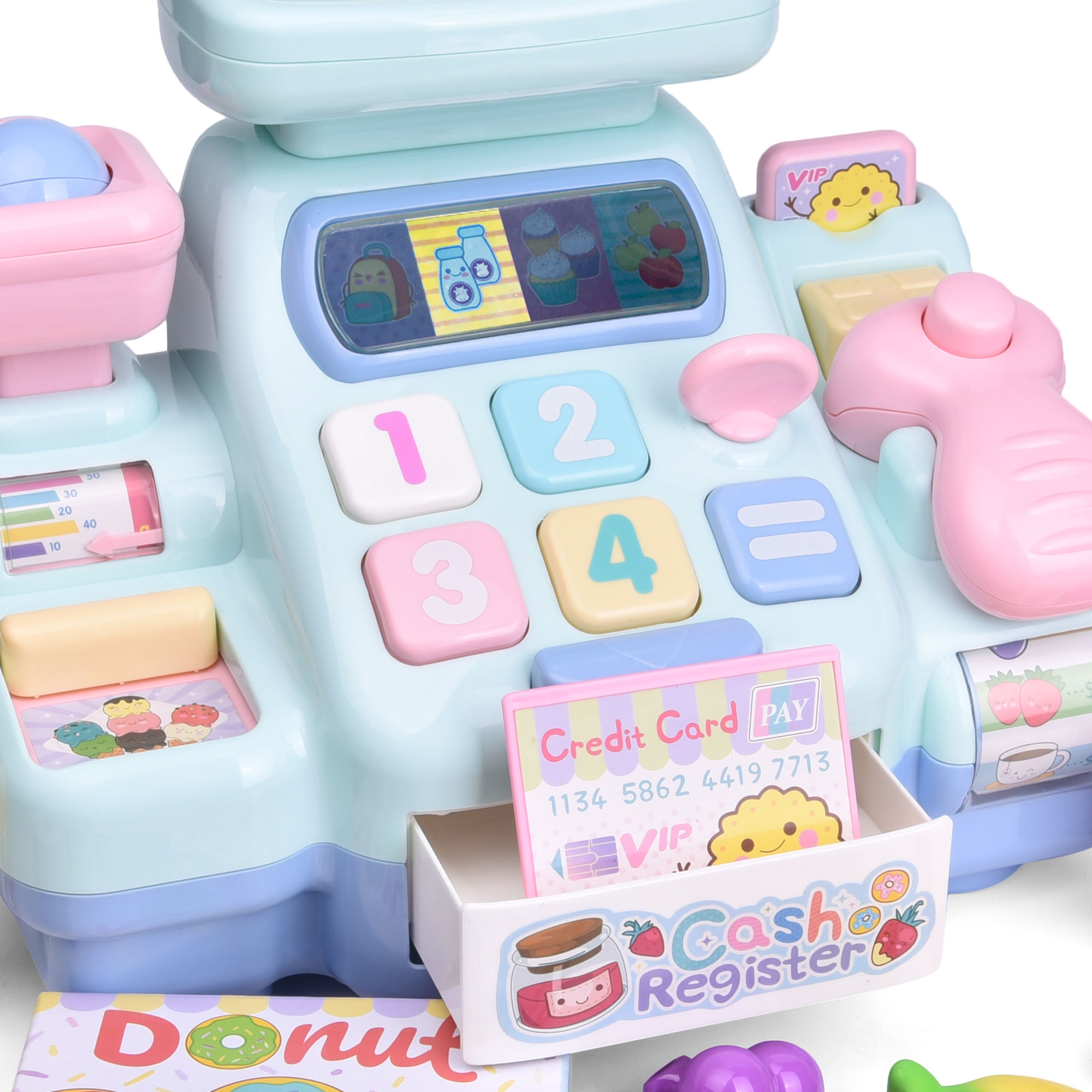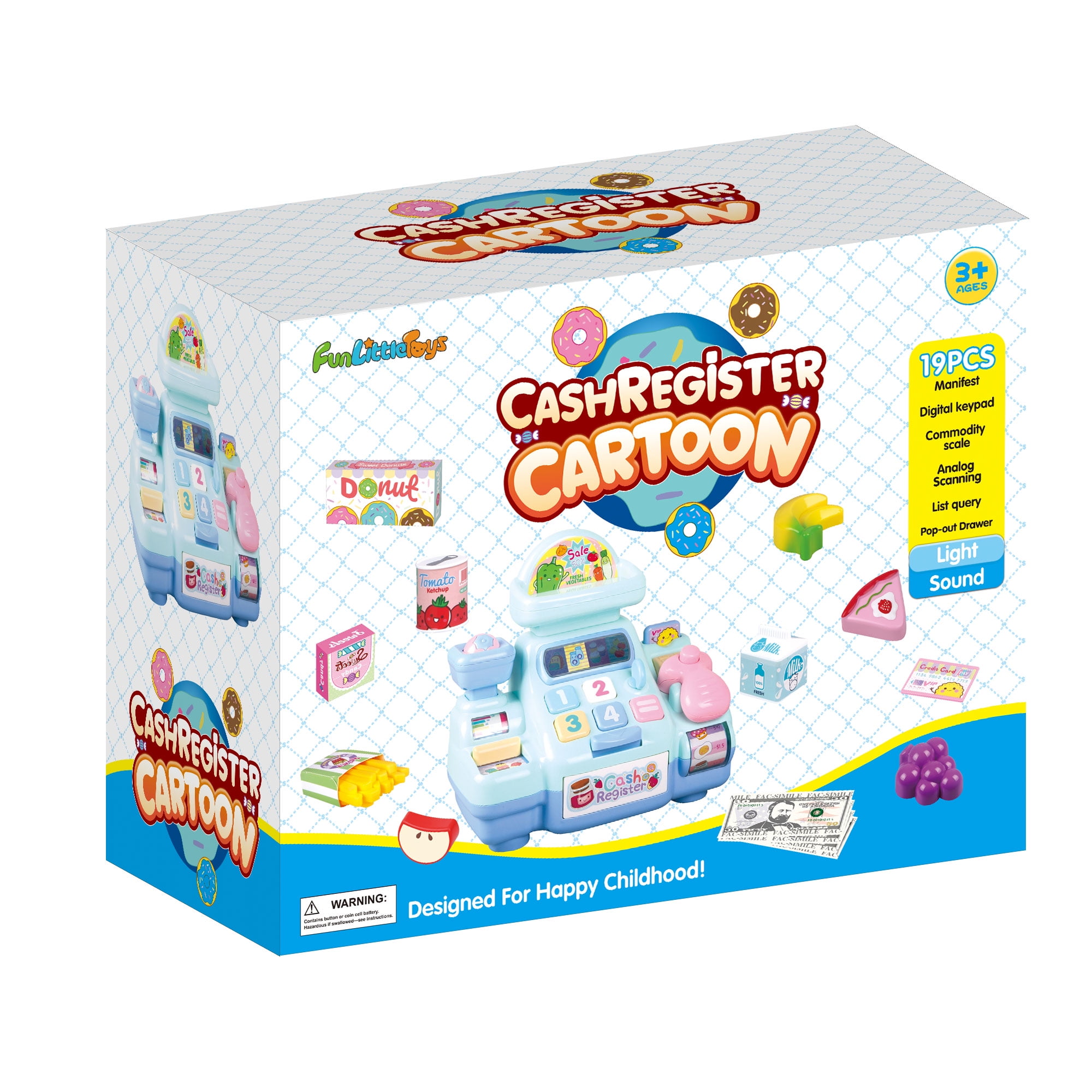 - Multi-functional cash register toy features a variety of fun sounds, music, play bar-code scanner, pop-out drawer, and screen