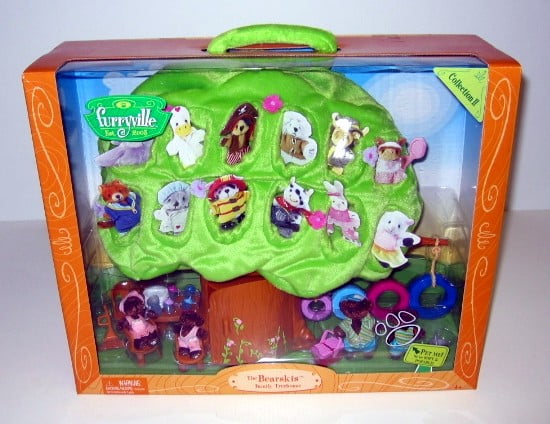 Welcome to Furryville where the teeniest, most adorable plush families celebrate the special moments that make up every day! The Furryville Treehouse is the center of town where everyone loves to hang out.The top of the tree features spots for up to twelve collectibles to be stored, while down below, the tree trunk opens to reveal places to eat, cook and swing. There is even an exclusive Brown Bear family, the Bearskis, included with the playset! Mr Bearski and his friends gather aroung the grill while Mrs Bearski gossips with her friends.The kids like to play on the tire swings and hang out up in the leaves while they wait to eat. The top of the tree disconnects from the trunk and turns into a purse with a zipper to carry all the play pieces and accessories. With so many great features, girls can play, display and take their town of Furryville on the go!*Bearskis are the only figures included with this Treehouse