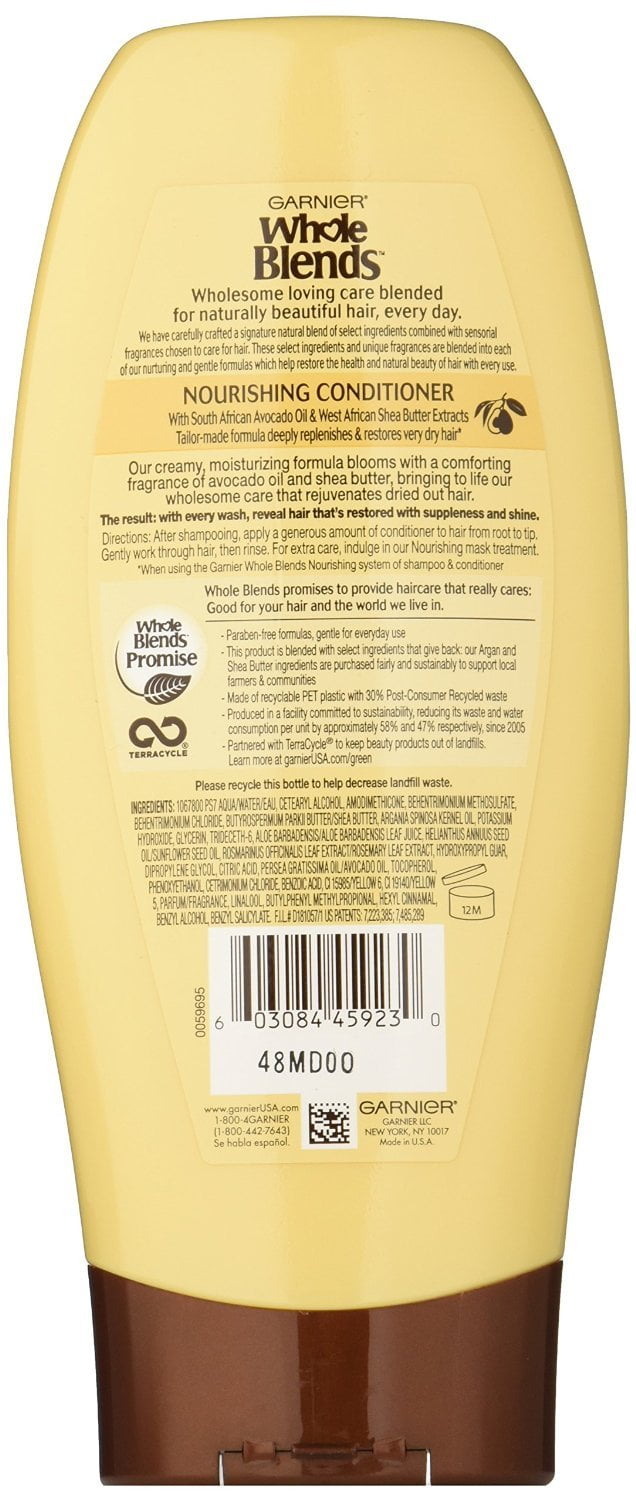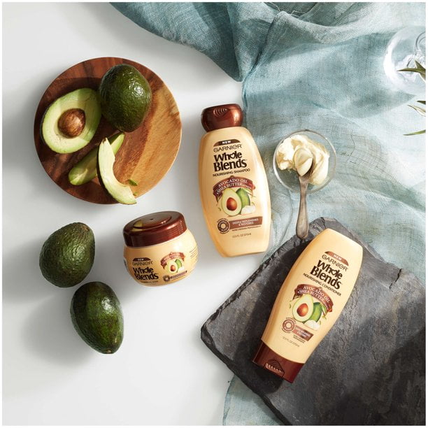 Garnier Whole Blends Avocado Oil & Shea Butter Extracts Nourishing Conditioner creamy, moisturizing formula blooms with a comforting fragrance of avocado oil and shea butter, bringing to life wholesome care that rejuvenates dried out hair.