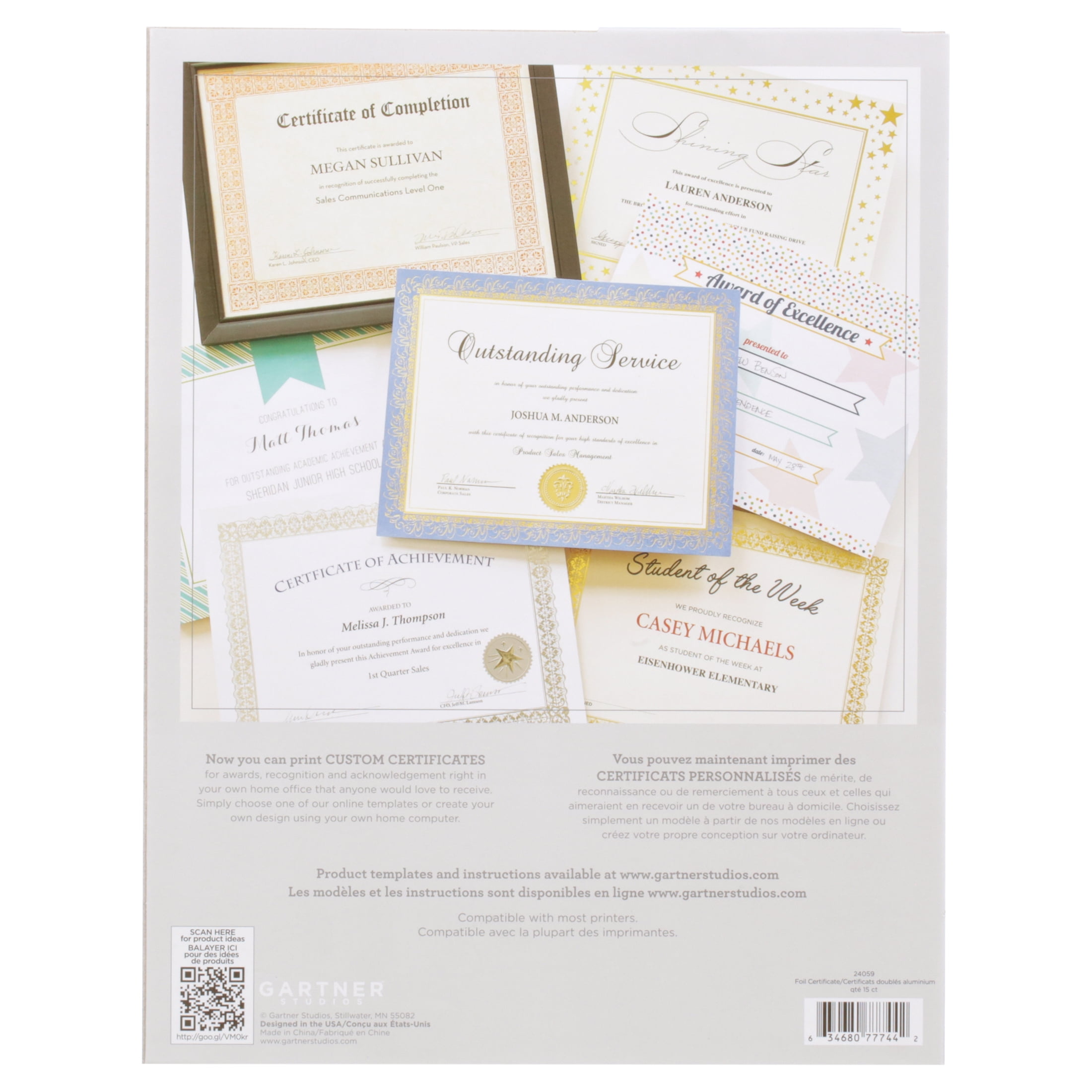Give Celebrate the achievement of someone special in your life with these Gartner Studios Silver Foil Border Certificates. These sophisticated 8.5” x 11” certificates feature an elegant classic design. The beautiful silver foil border will elevate the presentation of these certificates. Use this Gartner Studios certificate to present a sports team award, honor an employee’s great achievement, celebrate a kindergarten graduation or to offer recognition to a special person that will leave a lasting memory the recipient will cherish. The fully customizable templates make it easier than ever to print your own special message, all in the comfort of your own home. Use with any standard PC or laptop and home printer. This Gartner Studios certificate paper is available in a pack of 15. Check out other Gartner Studios office supplies at https://www..com/tp/gartner-studios to find cards, stationery, invitations, envelopes, decorations, and more! Gartner Studios is your one stop shop for all your office needs.