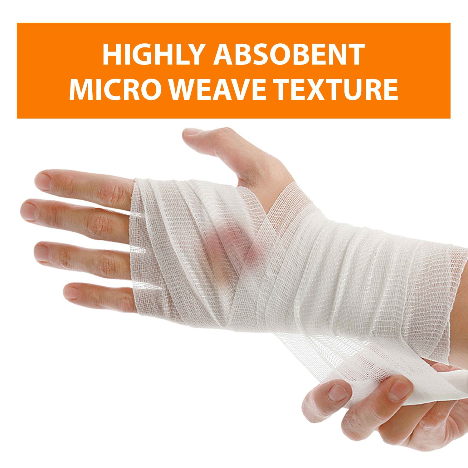 - HIGHLY ABSORBENT MICRO-WEAVE TEXTURE: Keep your wound clean, dry and protected from infections. This versatile professional hospital gauze roll is latex free and suitable for surgery after-care. Maximum absorption prevents bleed-through. Ideal bandage for patient recovering at home.