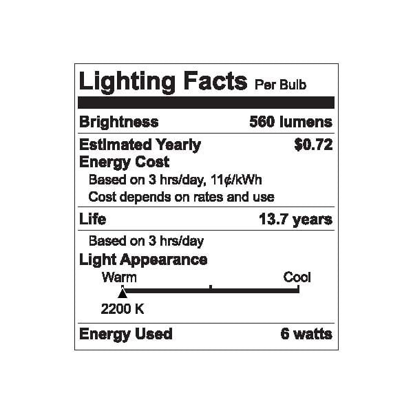 - 6-watt LED bulb (60-watt equivalent) with medium base and 560 lumens of brightness