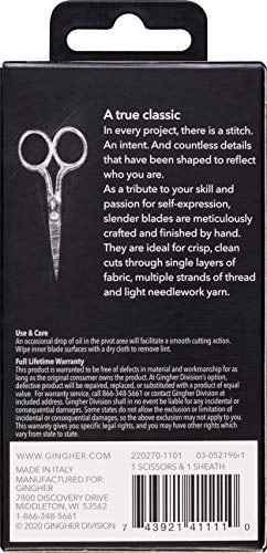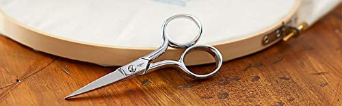 SKU:A basic necessity for sewing and needlework enthusiasts, Classic Embroidery Scissors feature a strong frame and slender blades ideal for cutting a single layer of fabric, multiple strands of thread and light needlework yarn. A double-plated chrome-over-nickel blade finish is both striking and durable, and a leather sheath protects the blades when not in use.