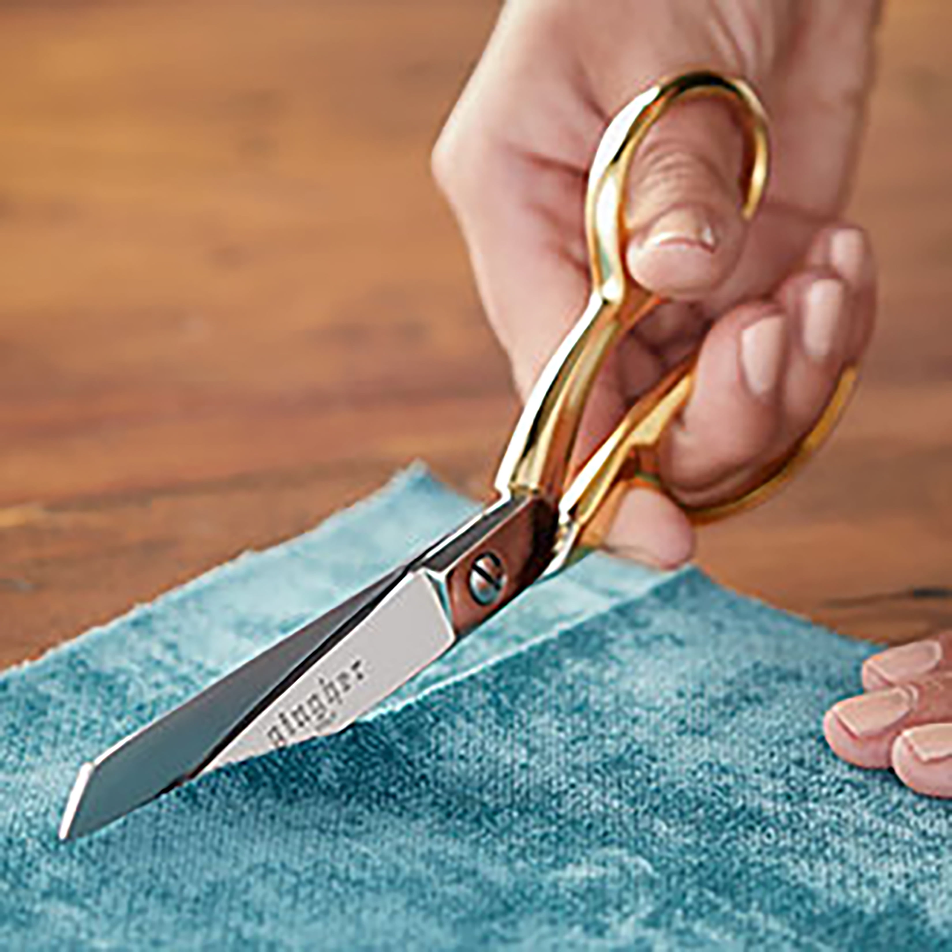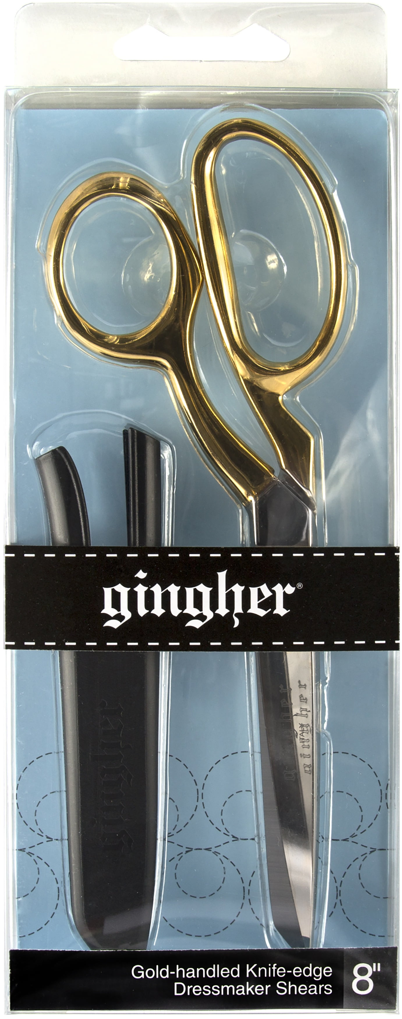 Gingher is recognized as the finest name in scissors and shears. Preserve the smooth cutting action by wiping the inside surface of the blades clean and adding an occasional drop of oil in the pivot area. 8" Knife Edge Dressmaker Shears Gold Handle Bent- Feature precision ground, knife edge blades that cut multiple layers of fabric, quilting, and general sewing needs. Gold-plated handles make them both striking and durable. Bent handle design helps to hold fabric flat on a table top or counter for smooth, comfortable mistake-free cutting. Includes a black safety-cover for travel and storage.