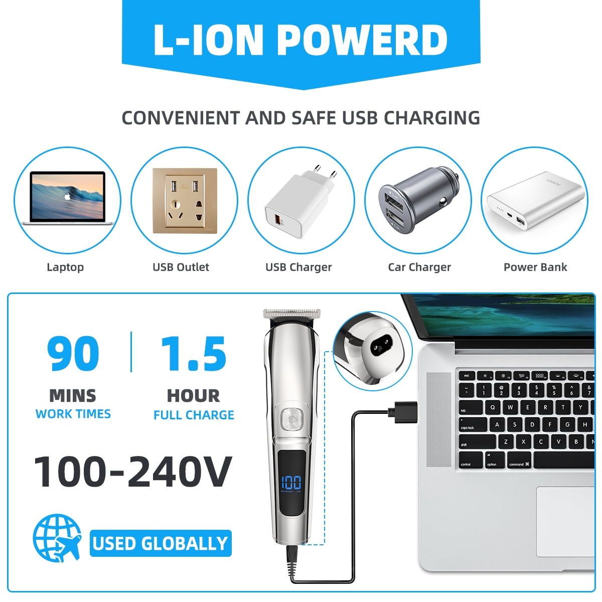 - 【USB Fast Charge & High Capacity Battery】Cordless Hair Trimmer with the high-quality Li-lon battery, up to about 90 minutes shaving time by only about 1.5 hour charging. Long-lasting lithium battery is perfect for travelling.