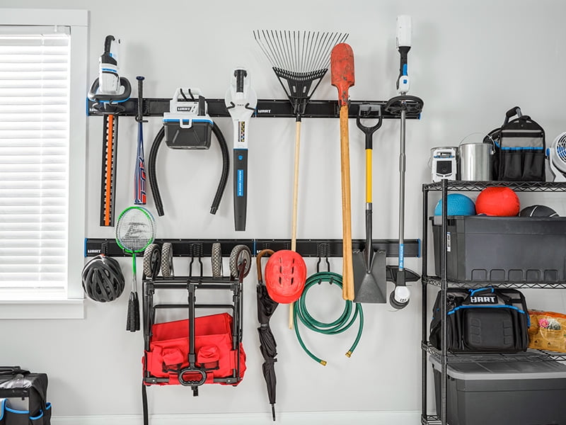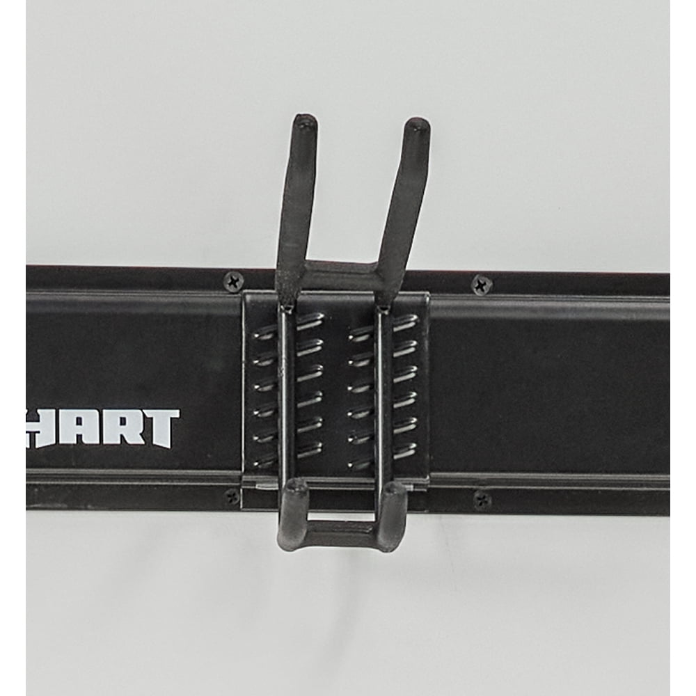 Ready to tackle the clutter in your garage? Start by freeing up some valuable floor space with HART’s 18 PC. Garage Storage Rail Starter Kit. The kit features (4) 36’ steel rails of solid horizontal storage and a good selection of tool holders and hooks. These rails are not only well-constructed, but also easy to install. Each one holds up to 250 lbs. for robust storage loads—with up to a 45 lb. load capacity per hook. And they look good while doing so. Since we supply the rails and easy-to-mount hardware, all you need are some basic hand tools, a power drill and about an hour of free time. Then before you know it, you’ll be crossing “declutter the garage” off your to-do list. When you’re ready, buy another one (or two) kits to organize your laundry room, the utility room, the craft room, the office—really any place that could use a little sprucing up. Kit includes: (4) 36” steel rails, mounting hardware, (1) power tools hook (2) large J hooks, (2) double hooks, (1) S hook, (2) single hook, (1) J hook, (1) S hook, (3) double hooks and (1) dual utility hook, endcaps & operator’s manual. Make the most of your garage space with HART.