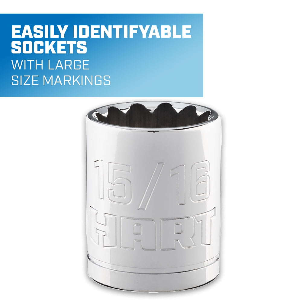 The HART 26 Pc. 3/8-inch Mechanics Set is the perfect set to add on to or start your DIY mechanic’s toolbox. The set comes with a 90-tooth ratchet with up to 20% more access in those tight, hard-to-reach places due to the 4-degree arc swing allowing for quicker access with less movement. The quick release provides superior socket hold while the easy-release button and the reverse lever allows for the changing of sockets or working direction to be quick and easy while being done with one hand. This set comes with a full chrome finish for durability and added rust resistance. The large size markings on the sockets make for quick and easy tool identification. This set includes (1) 3/8-inch drive ratchet and (12) SAE sockets in a variety of sizes from 1/4-inch to 7/8-inch and (13) Metric sockets from 7mm to 19mm. All tools included come packaged in an organizer carrying case for easy storage and portability. All tool included are also covered by HART’s Lifetime Limited Warranty.