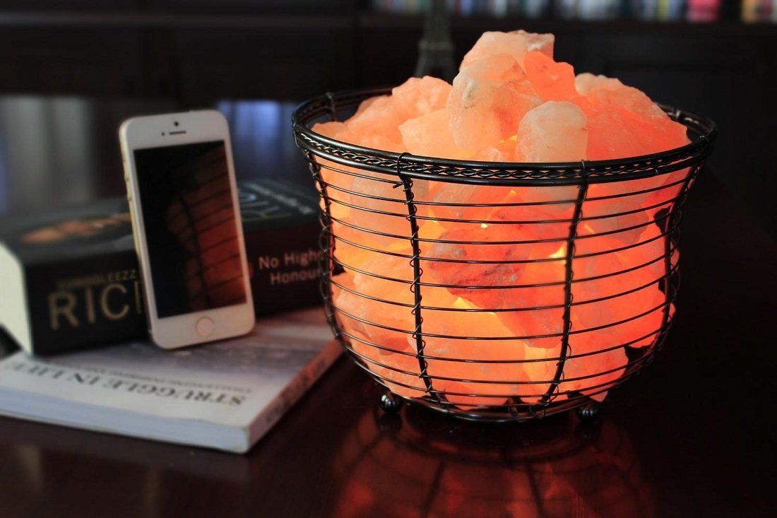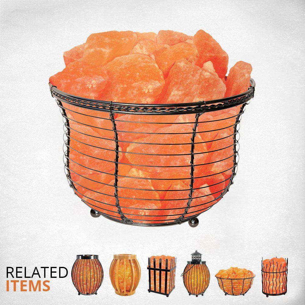 Transform your space with a Basket. Himalayan salt chunks have been used for centuries as air purifiers, naturally removing impurities and excess humidity. Today, they’re also used to make rock salt crystal lamps, casting a soft, soothing pink glow throughout your space as they purify the air and emit negative ions that fight against electromagnetic radiation. These striking lamps have been staples at wellness centers, spas, yoga studios, and meditation spaces, featuring a variety of different designs that range from large salt chunks to carved pyramids and more. This 8" design features small pieces of Himalayan pink crystal salt, artfully arranged inside a decorative wire basket. The light fixture is located inside the crystal cluster for easy light bulb changing. The features hand-mined, hand-carved salt, 6′ cords, and dimmer switches for easy light adjustment. A light bulb is included for easy use.