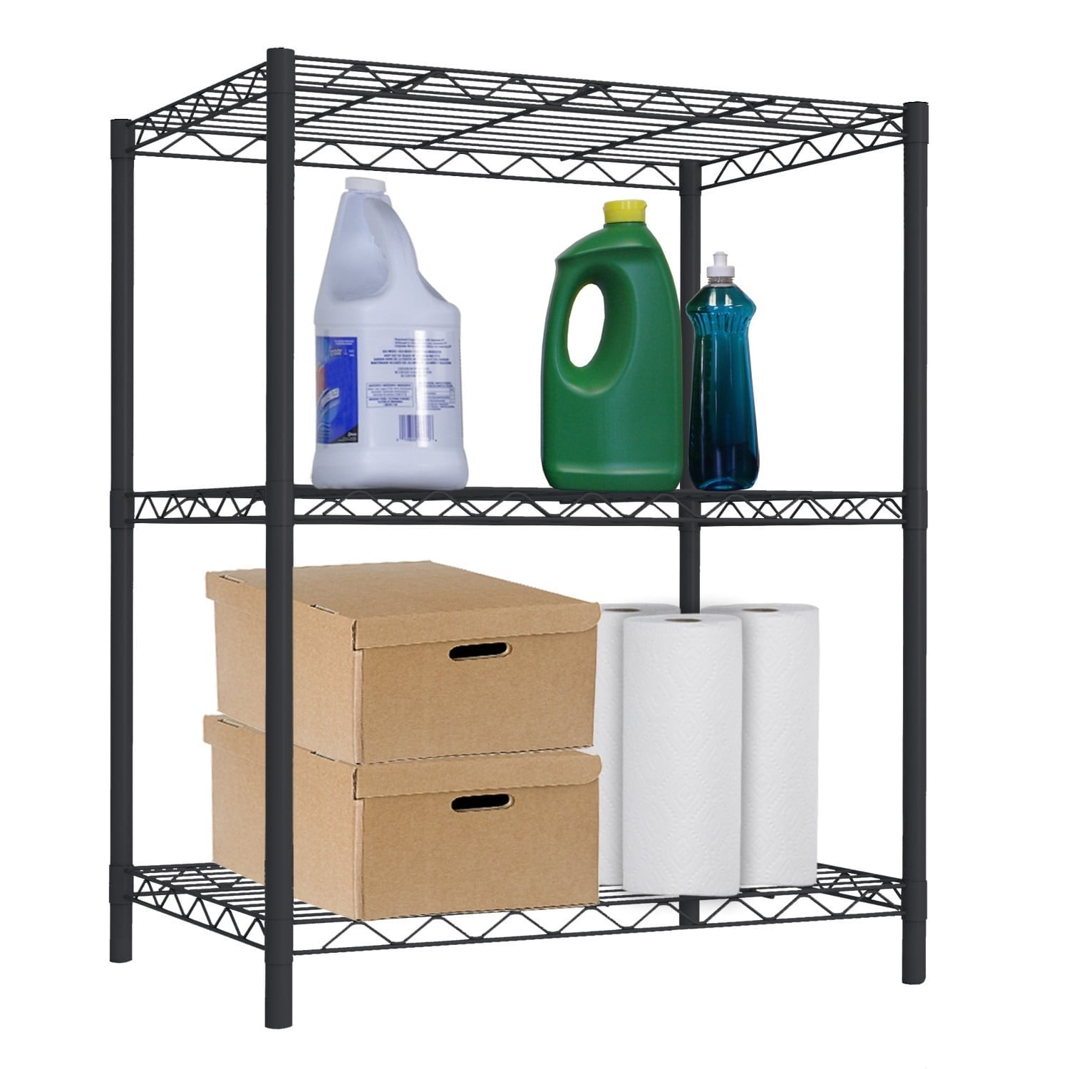 Keep your living space neat and tidy with the Home Basics Wire Shelf. It is sturdy and made from strong steel. This three-layer black wire shelf is suitable for any room. Use it for holding cleaning supplies, toys, towels, food and much more. It is very easy to put together.