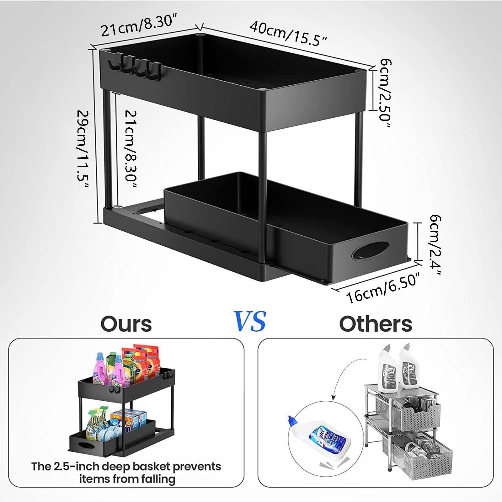 • Sliding drawer: this sink finisher adopts double-layer design to maximize the use of vertical space. Equipped with fixed basket and slide out basket with handle, you can easily get your items. It is equipped with 4 side hooks to hang some small objects and make effective use of the limited space .