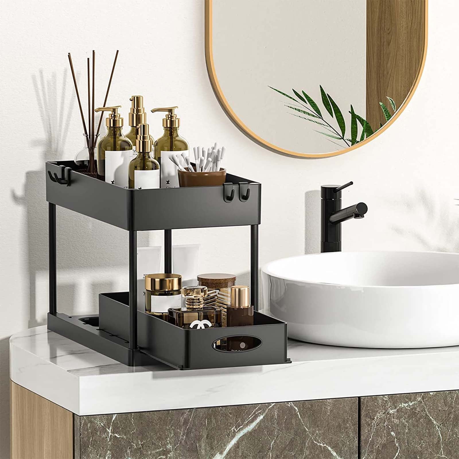 Home Edit Storage Floweek Double Layer Sink Storage Box Bathroom Kitchen Lockers Bottom Slide Out Basket With Hook Handle Cabinet Basket Storage Drawer Narrow Slot Shelf Black One Size F4139