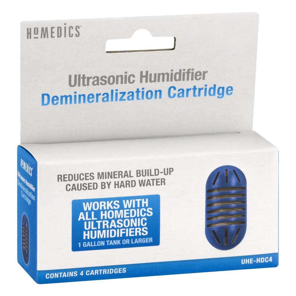 Homedics Demineralization Cartridges are used in ultrasonic humidifiers to help prevent mineral buildup and maintain efficient operation. The cartridges works with all HoMedics ultrasonic humidifiers that are sized one-gallon and larger. These humidifier demineralization cartridges are easy to use. Simply drop one tab into your device’s water tank to help reduce mineral buildup and stop "white dust" from forming in your humidifier The cartridge is necessary about every 30 to 40 fillings, but may vary based on the hardness (mineral content) of your water.