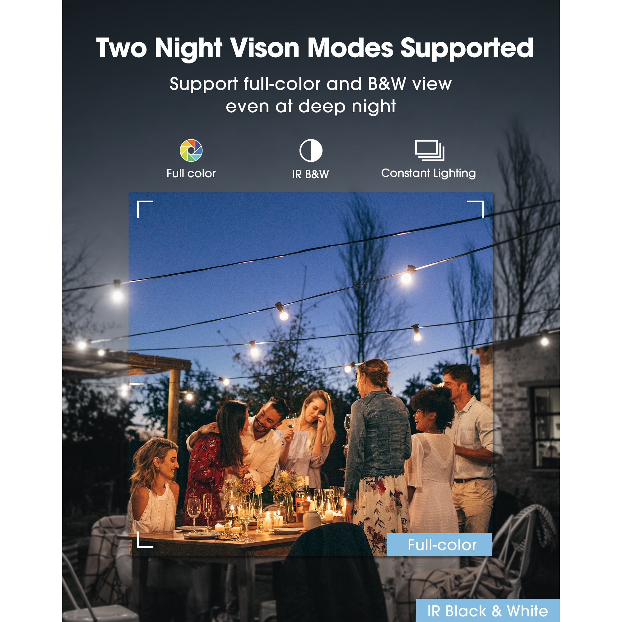 With the internal 4 floodlights and IR LED lights, this home security camera gets a full-color view even at deep night, so that you can see every detail in dark, which is much better than the other 1080p B&W cameras. And you can also choose IR B&W mode or constant lighting mode as you need.