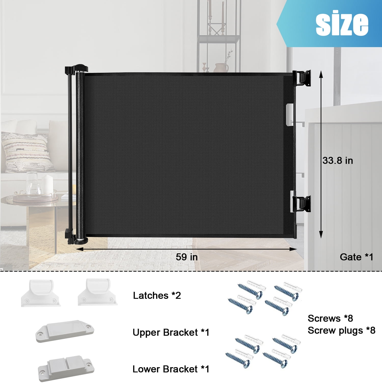 - Retractable Design-Saving Space: Retractable baby gate This baby gates Fits openings up to 55" wide and is 33" tall which can be adjusted to fit your openings according to your needs. Retractable baby gate can be completely retracted away when not in use