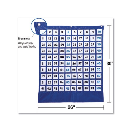 Illustrate fundamental math concepts, patterns, multiples. Features 100, 2" wide clear acrylic pockets and includes cards labeled 1-100 with multiples of 2, 3, 5 and 10 highlighted in different colors. Durable flame-retardant nylon construction with grommets for hanging. Pocket Chart Type: Math Total Pockets: 105 Width: 26" Height: 30".