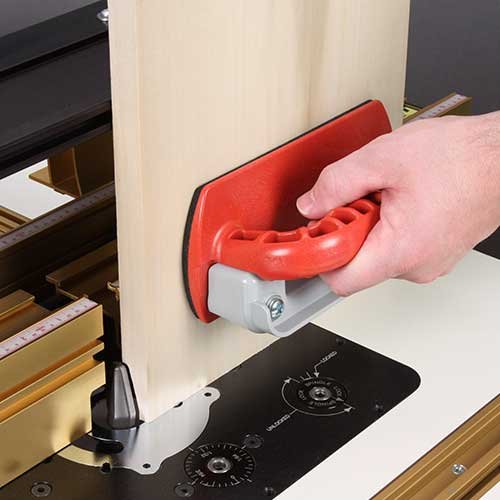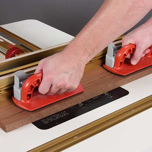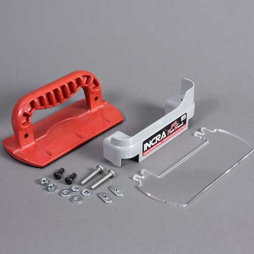 The new INCRA PushGuard combines an oversized push block with both an integrated hand guard and a removable debris shield, giving you triple the safety features of conventional push blocks. The hand guard is designed to always be positioned between your hand and the cutter, an important safety feature for those times when a traditional guard cannot be attached to your fence. The clear, removable deflector shield blocks flying debris to help protect your eyes as well as your hands. In addition to its superior safety features, the PushGuard will improve your work-piece control and accuracy. The rubber pad on the bottom of the push block is a generous 7-1/2" x 3-1/2" and provides the perfect gripping surface for smooth or rough cut lumber — no slipping! Additionally, the PushGuard’s ergonomic handle has been smoothed all the way around with deep ribbing on both sides for a comfortable, powerful grip, and its large diameter enables you to operate it with both hands for more control. The handle is also slightly offset from vertical to better align with your shoulder and provide extra clearance between you and the cutter. INCRA’s PushGuard is the ideal tool for precice work-piece control and superior safety for your hands and eyes!