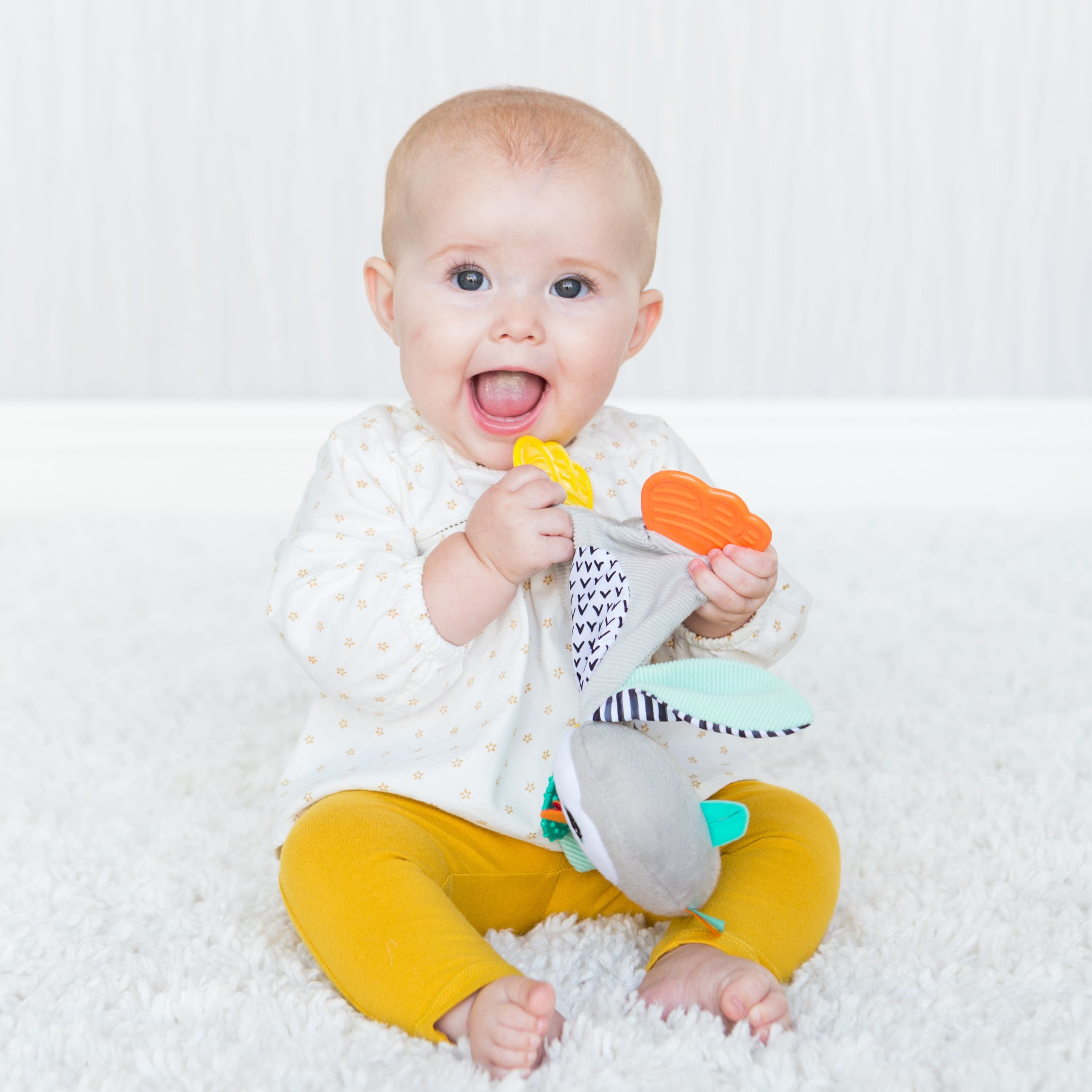 This snuggly teether toy features unique textures and crinkle sounds baby will love exploring. Babies are drawn to the bold colors, playful prints and soft fabrics. Features three BPA-teethers textured teethers for nibbling.
