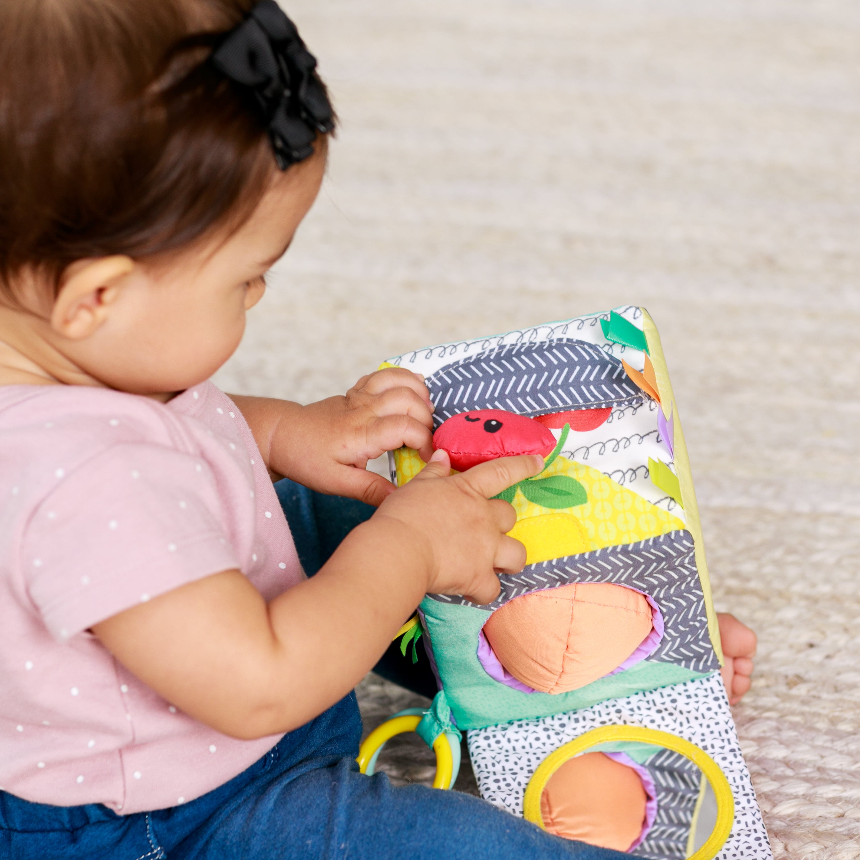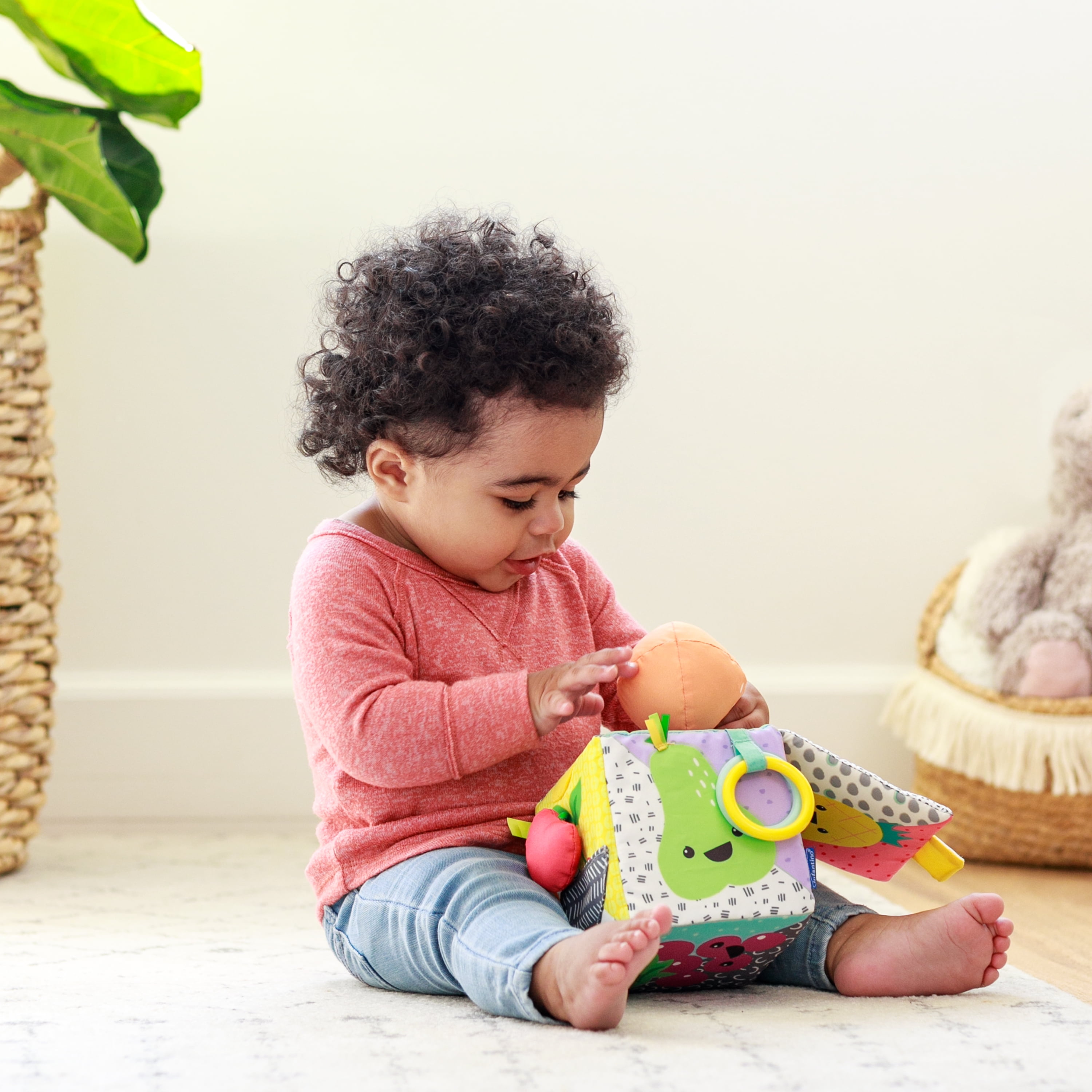 The Infantino Peek & Seek Sensory Discovery Cube helps curious little hands and minds discover a variety of developmental activities. Your baby’s senses will be awakened with colorful fiddle flags, crinkle sounds, and interesting textures. A giant selfie mirror introduces self awareness and tucks away neatly inside. Lift the lid for an endless game of peek & seek with a sweet surprise. This cuddly soft cube is perfectly sized for little ones to hold and easy-to-link for on-the-go play adventures.