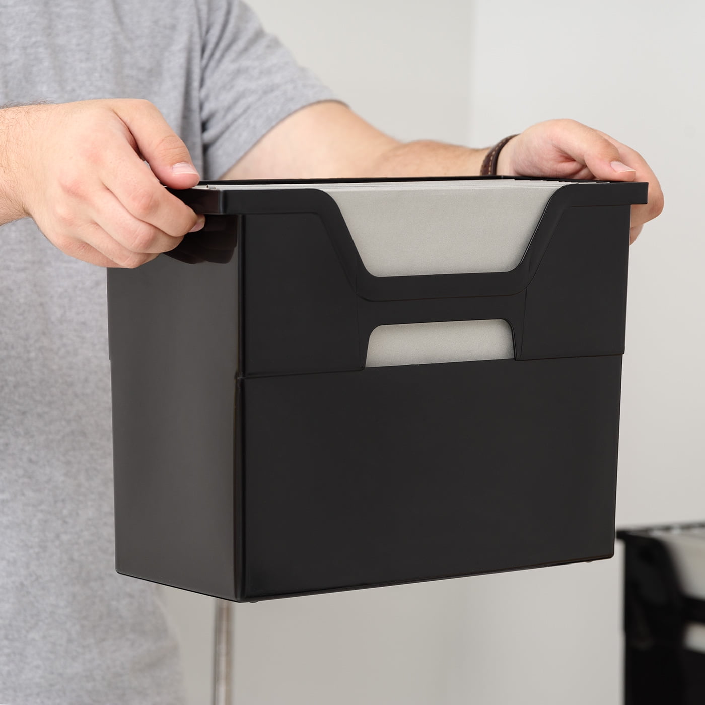 - Holds letter size hanging files