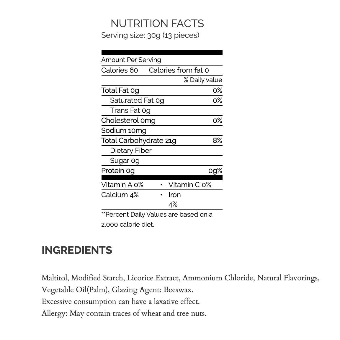 Ingredients: Maltitol, Modified Starch, Licorice Extract, Ammonium Chloride, Natural Flavorings, Vegetable Oil(Palm), Glazing Agent: Beeswax.