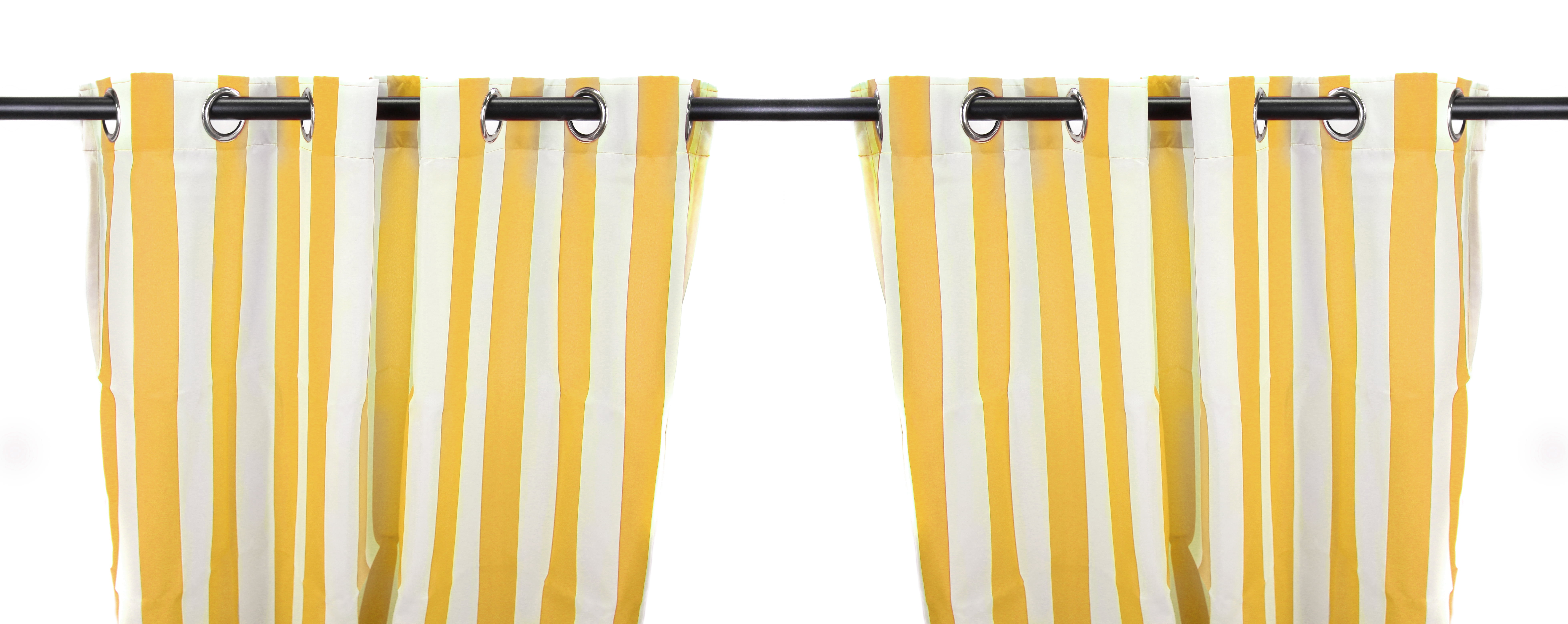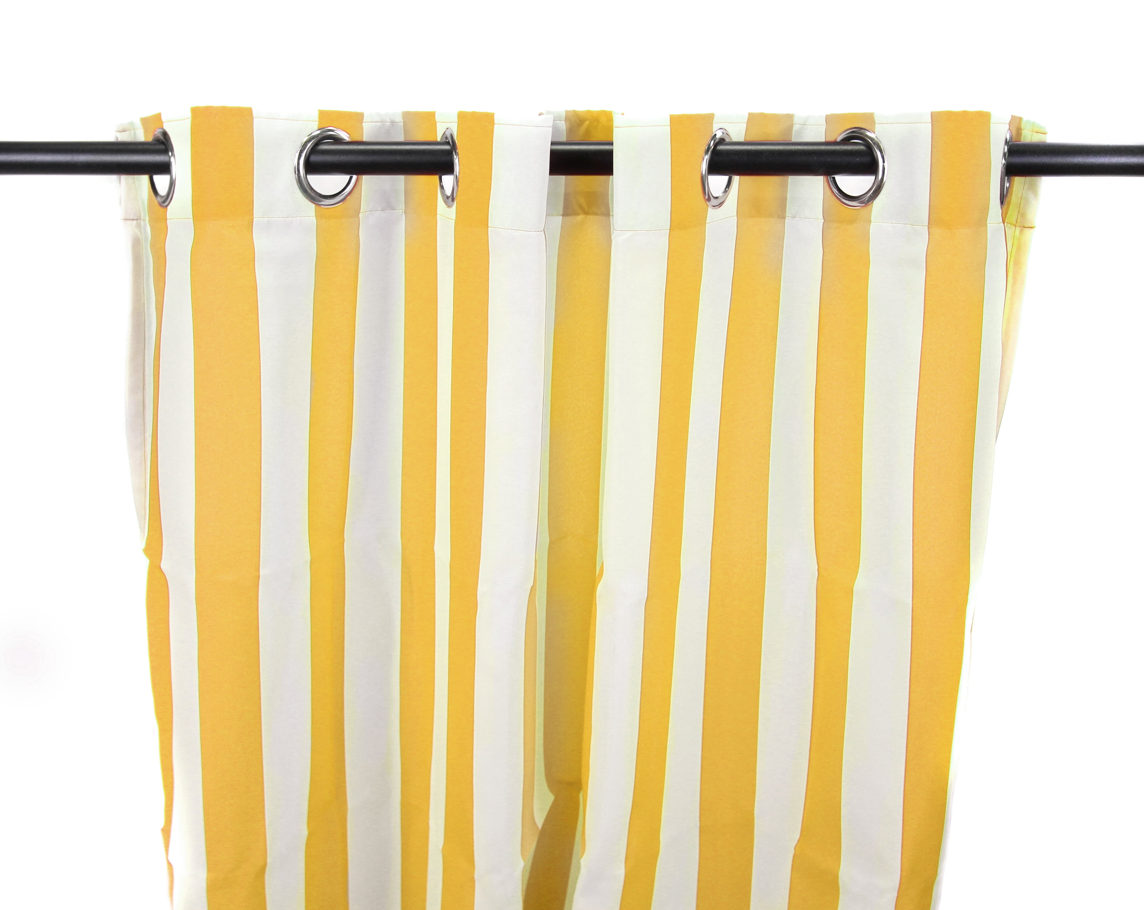 Cool off while collecting compliments for your impeccable design taste when you add this set of 54-inch by 84-inch Grommet Curtain Panels to your outdoor oasis. Designed to flow with the summer breeze, these lightweight curtain panels feature semi-sheer fabric that provides just enough sunlight-blocking shade to keep you cool without darkening your patio or gazebo too much. These durable outdoor curtains are constructed from water-, stain-, mold- and mildew-resistant fabric that will look great all season long. Plus, each grommet panel is UV protected to prevent fading after hours of fun in the sun. Bring sophisticated style to your outside living areas with this flowy curtain set featuring a sewn hem edge on every side for a finished look. Durable stainless steel grommets along the top prevent the fabric from fraying and make sliding across curtain rods a cinch. Best of all, these grommet-top panels add chic shade without adding maintenance, thanks to the easy-care fabric that requires only a quick spot clean with soap, water and a soft cloth.Jordan Manufacturing 54" x 84" Yellow Stripe Grommet Semi-Sheer Outdoor Curtain Panels (2-Pack)