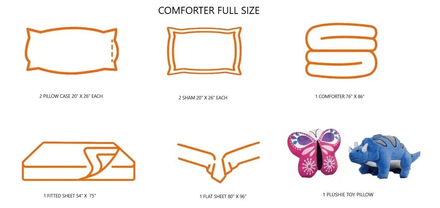 - Keep your little one as cozy as can be! Different designs FULL bed set is super soft and great for all seasons. 100% brushed microfiber polyester allows for a comfortable night’s sleep. Fade resistant and machine washable. FULL SIZE: 1 Comforter 76"x 86"in, 2 Sham 20"x 26"in, 1 Flat Sheet 80"x 96"in, 1 Fitted Sheet 54"x 75"in, 2 Pillowcase 20"x 30"in, 1 Furry Friend Toy.