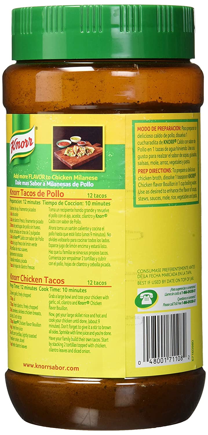 Knorr Granulated Chicken Bouillon is a mix blending flavors of chicken, onion, parsley, and spices together for rich chicken seasoning. Add the authentic Knorr chicken bouillon flavor to all your chicken dishes with this versatile product that is made with natural flavors and is fat free and cholesterol free. Knorr Granulated Bouillon is an essential pantry item with everyday use. The granulated format allows for ultimate versatility for all your cooking needs. Granulated bouillon dissolves more quickly than cubes and 1 tablespoon of granulated bouillon is the equivalent of 1 bouillon cube. Use Knorr Granulated Chicken Flavor Bouillon to enhance flavor in any recipe, like delicious Knorr Chicken Tacos, as well as in other types of dishes like soups, stews, sauces, rice, vegetables, pastas and other chicken dishes. Knorr Granulated Bouillon comes in additional sizes and great flavors including Tomato Chicken, Reduced Sodium Chicken, Beef, and Shrimp so you can be sure to find the Latin flavors your family will love. Knorr believes that good food matters and everyday meals can be just as magical as special occasions. Knorr products owe their taste and flavors to the culinary skills and passion of its chefs. Knorr sources high-quality ingredients to create delicious side dishes, bouillons, sauces, gravies, soups and seasonings enjoyed by families everywhere.