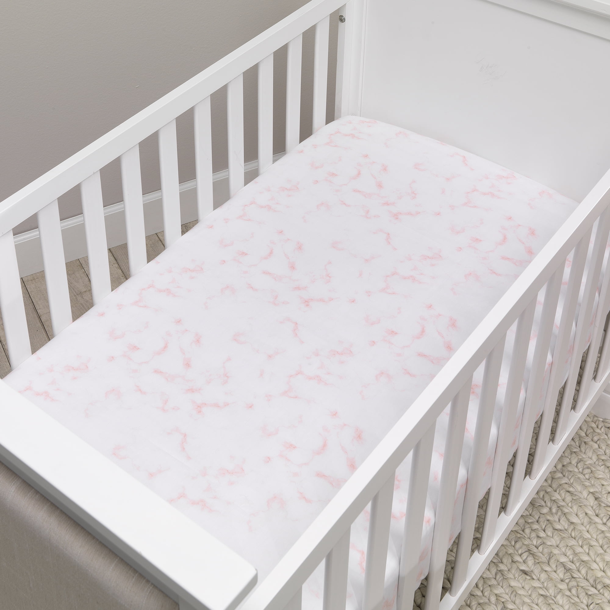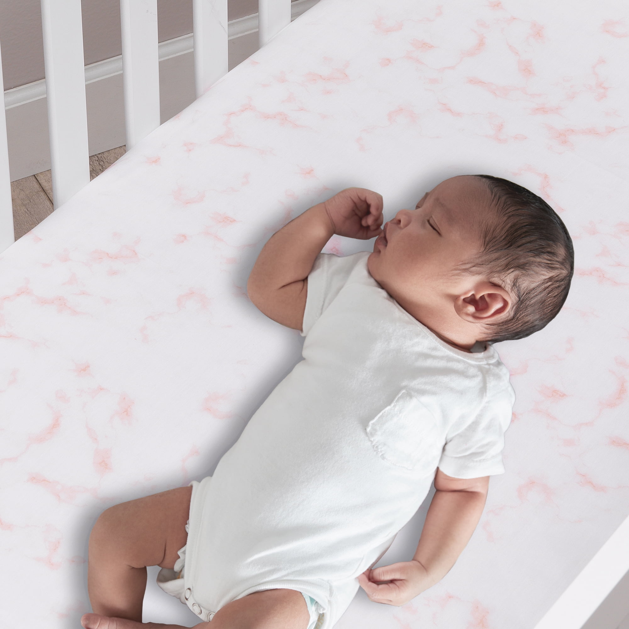 This pink marble pattern fitted crib sheet is 100% Certified Organic breathable cotton is pure and safe for baby. Its fully elastic perimeter provides a safe and secure fit. The marble design has a watercolor look in pretty shades of pink and white. It is a perfect blend of style and comfort. Machine washable for easy care.