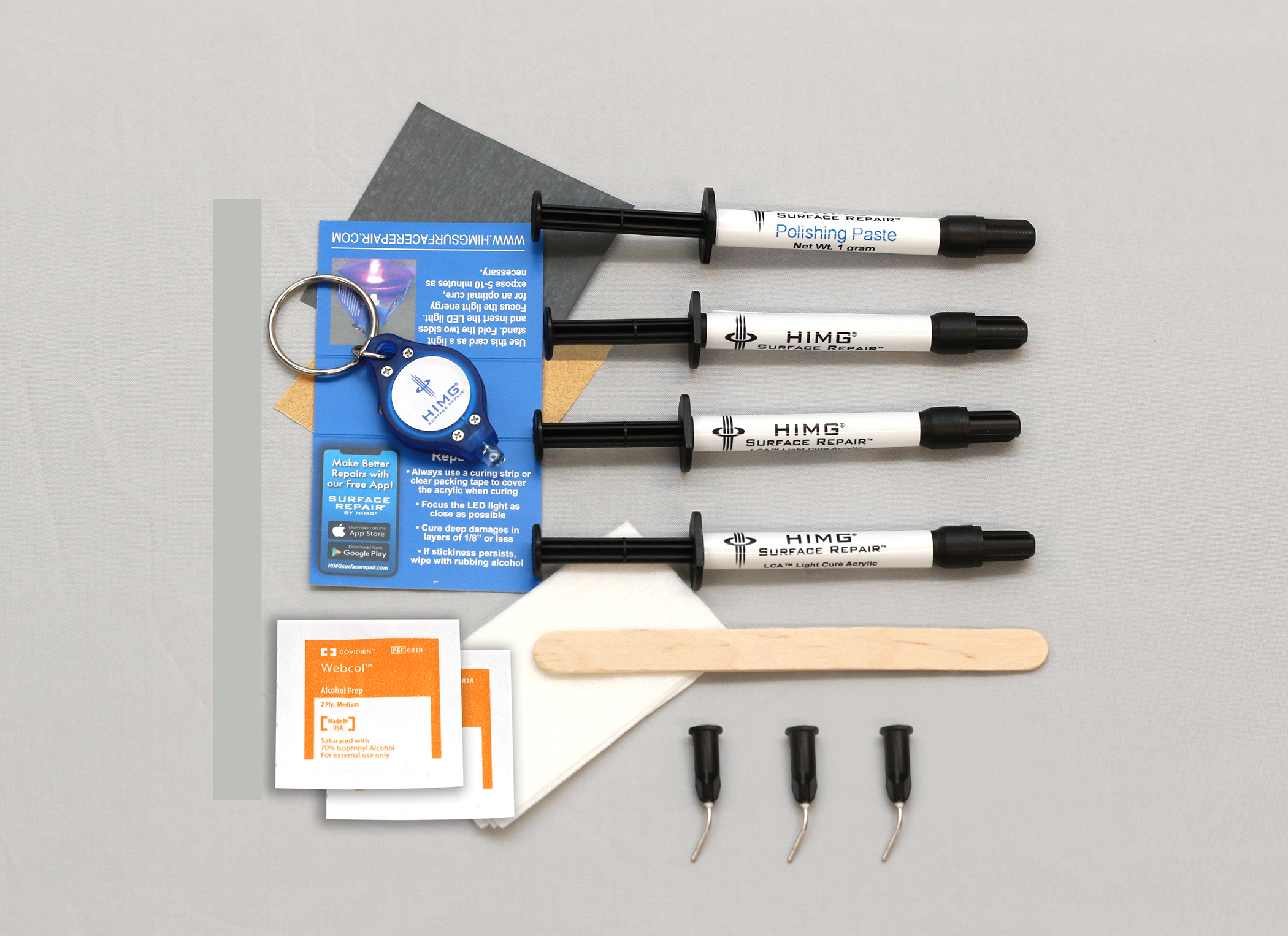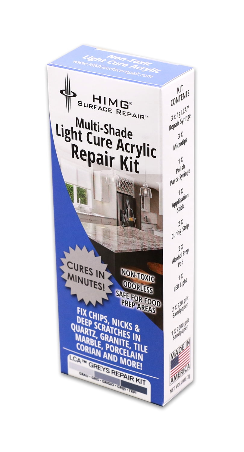 Light Cure Acrylic repair kit for granite, marble, tile, corian, quartz, cultured marble. Fix chips, nicks and deep scratches ins inks, bathtubs, counter tops or shower trays. 3 shades or repair product included: Whisper Grey, Grey and Thunder. Try our non-toxic, DIY kit, made in the USA.