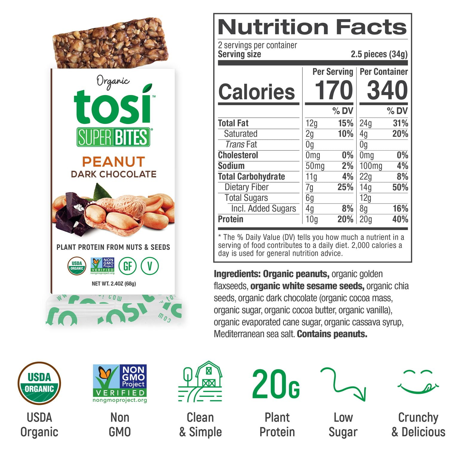 TOSI SuperBites, Gluten-Free Snack Bars, Peanut Dark Chocolate, Vegan, Organic, 2.4 oz, 12 bars