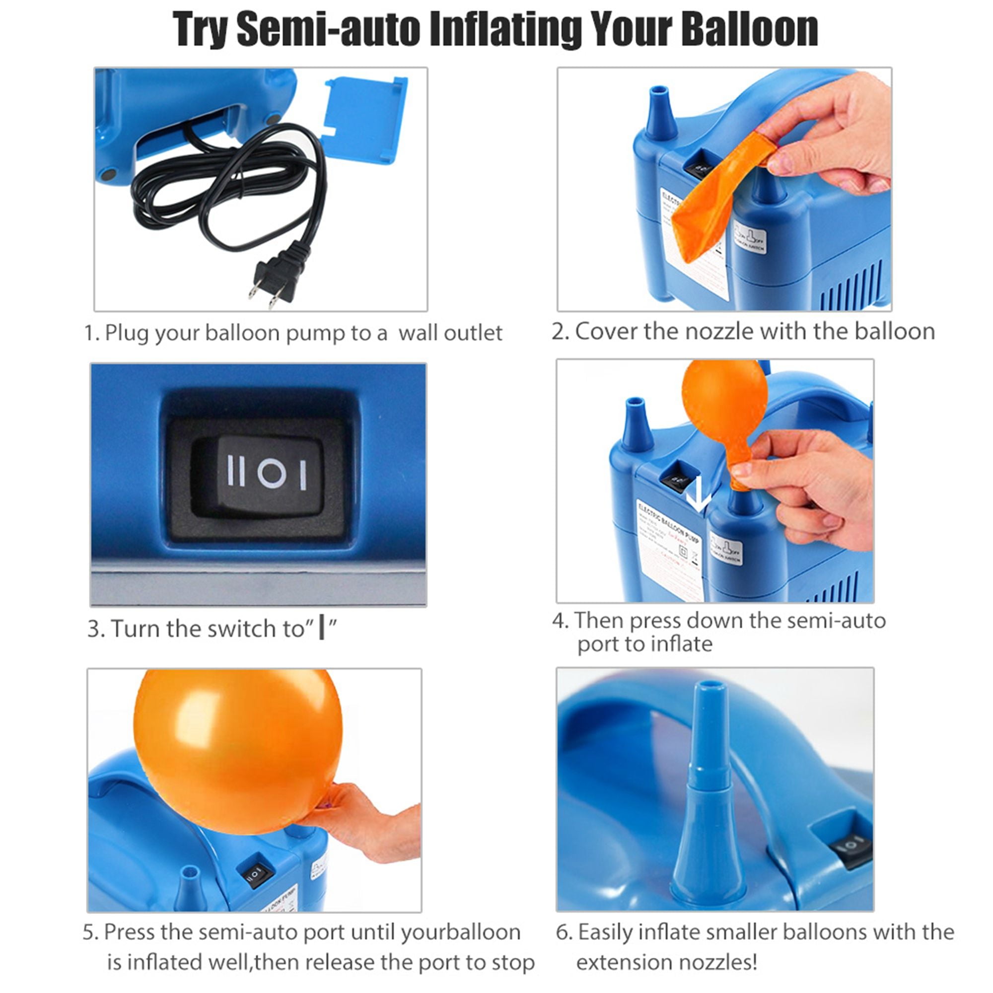 【FAST & EFFICIENT】This electric balloon inflator offers TWO OPERATING MODES, manual and automatic modes, inflating latex balloon and decorative balloon; DOUBLE NOZZLE makes you pump 2 balloons at a time; TWO EXTENDED NOZZLES to fit different sized balloons
