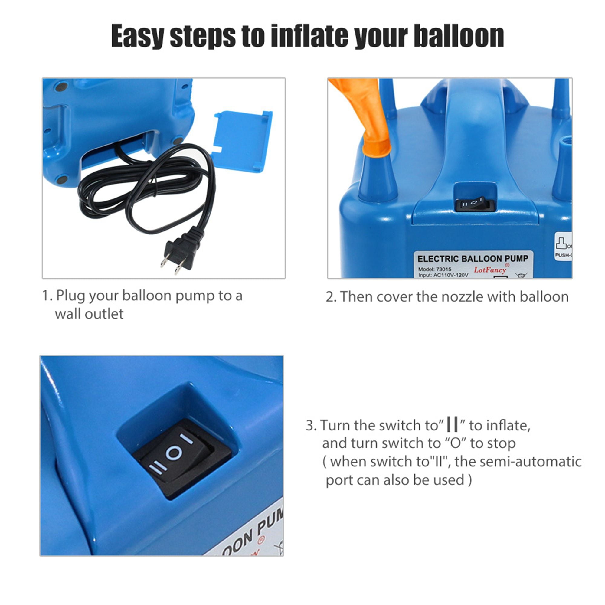 【ADVANCED DESIGN】Wire can be stored in the built-in storage compartment; Semi Auto : Switch to “I”, Cover the nozzle with balloon, press the nozzle slightly to inflate, release to stop; Auto: Switch to “Ⅱ”, cover the nozzle with balloon for consistent inflating, and switch to “O” to stop
