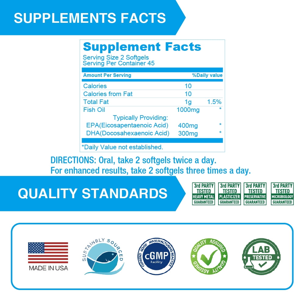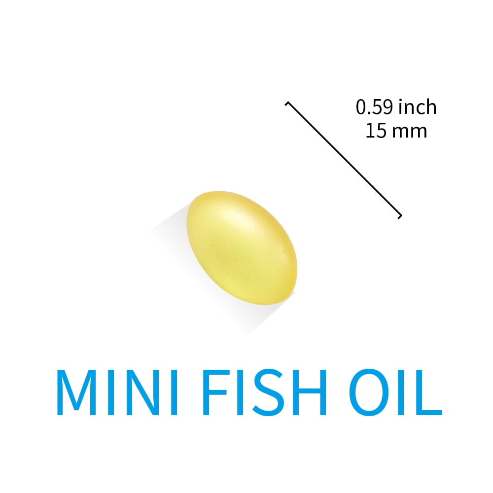 SMALLER SIZE + HIGHER POTENCY: Our Mini Fish Oil comes in small size while delivering the high potency possible. Each serving (2 softgels) contains 1,000mg fish oil with 700mg of Omega-3 Fatty Acids (400mg EPA, 300mg DHA). MINI SOFTGELS: Our mini sized softgels are easy to swallow and ideal for consumption by women and seniors. The softgels are 60% smaller than our regular fish oil supplements. DESIGNED FOR BETTER ABSORPTION & NO FISHY AFTERTASTE: Enteric coating for better absorption of the Omega-3 fatty acids resulting in no fishy aftertaste or burps. Each serving delivers concentrated EPA and DHA in true triglyceride form for optimal absorption. PREMIUM QUALITY: Our Mini Fish Oil is sustainably sourced and does not contain wheat, gluten, artificial colors, artificial sweeteners or artificial preservatives. MADE IN USA: Products are made in the USA by a leading manufacturer in a state of the art facility complied with cGMP standards. We promise to provide only the best quality products that are researched and manufactured by highly skilled researchers and engineers for our customers.SMALLER SIZE + HIGHER POTENCY: Our Mini Fish Oil comes in small size while delivering the high potency possible. Each serving (2 softgels) contains 1,000mg fish oil with 700mg of Omega-3 Fatty Acids (400mg EPA, 300mg DHA). MINI SOFTGELS: Our mini sized softgels are easy to swallow and ideal for cons
