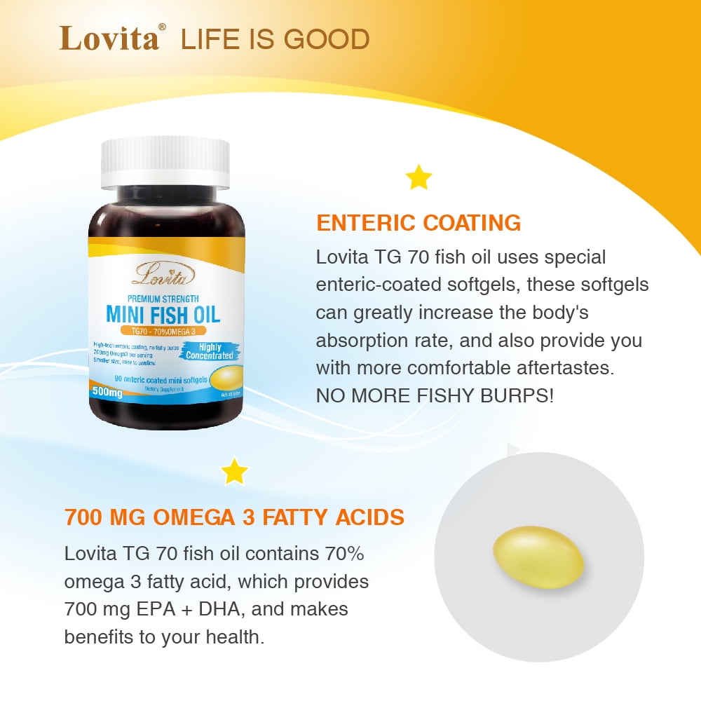 Lovita Mini Fish Oil 500mg, High Concentrated Omega 3, Easy to Swallow for Women and Senior, Burpless, 90 Enteric Coated Softgels