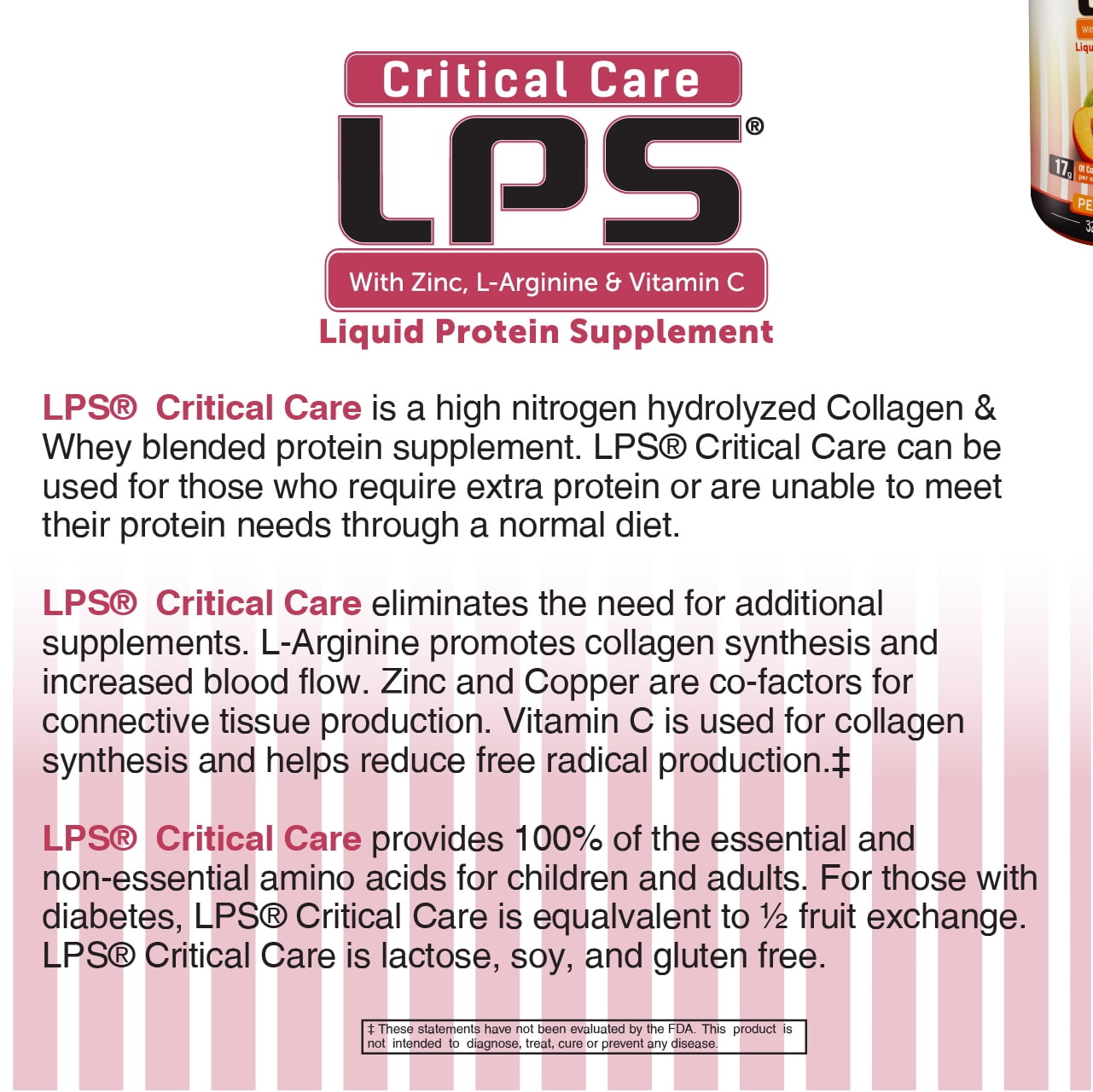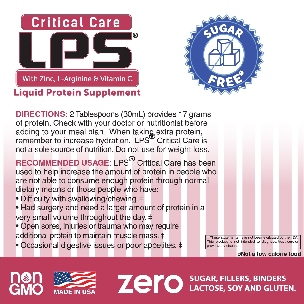 Have mild wounds or sores? Our LPS Critical Care® is a sugar-free, liquid protein supplement for wound healing that also contains Zinc, L-Arginine & Vitamin C & offers 17 grams of protein per serving in 2 tablespoons (1 capful = 1 dose). LPS® Critical Care eliminates the need for additional supplements. L-Arginine promotes collagen synthesis & increased blood flow. Zinc & Copper are co-factors for connective tissue production. Vitamin C is used for collagen synthesis & helps reduce free radical production. LPS Critical Care® has been used to help increase the amount of protein in people who are not able to consume enough protein through normal dietary means or people who may struggle with chewing/swallowing, need more protein, open sores or injuries that may require additional protein to maintain muscle mass, and for the people who struggle with digestive issues. Do not use for weight loss.