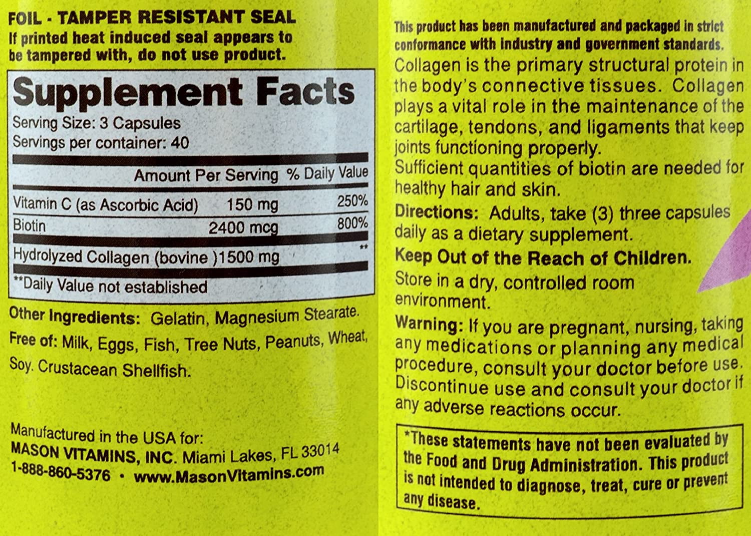 This product has been manufactured and packaged in strict conformance with Industry and government standards.Collagen is the primary structural protein in the body’s connective tissues. Collagen plays a vital role in the maintenance of the cartilage, tendons, and ligaments that keep joints functioning properly.Sufficient quantities of biotin are needed for healthy hair and skin.Suggested UseAdults, take (3) three capsules daily as a dietary supplement.Other IngredientsGelatin, magnesium stearate.Free of: Milk, eggs, fish, tree nuts, peanuts, wheat, soy. Crustacean shellfish.WarningsFoil-Tamper Resistant SealIf printed heat induced seal appears to be tampered with, do not use product.Keep out of the reach of children.Store in a dry, controlled room environment.If you are pregnant, nursing, taking any medications or planning any medical procedure, consult your doctor before use. Discontinue use and consult your doctor if any adverse reactions occur.
