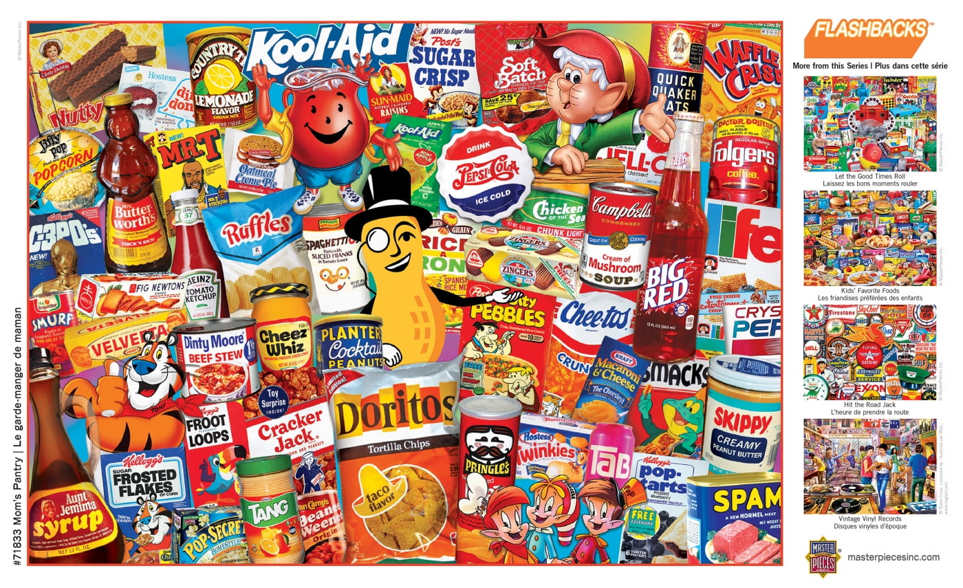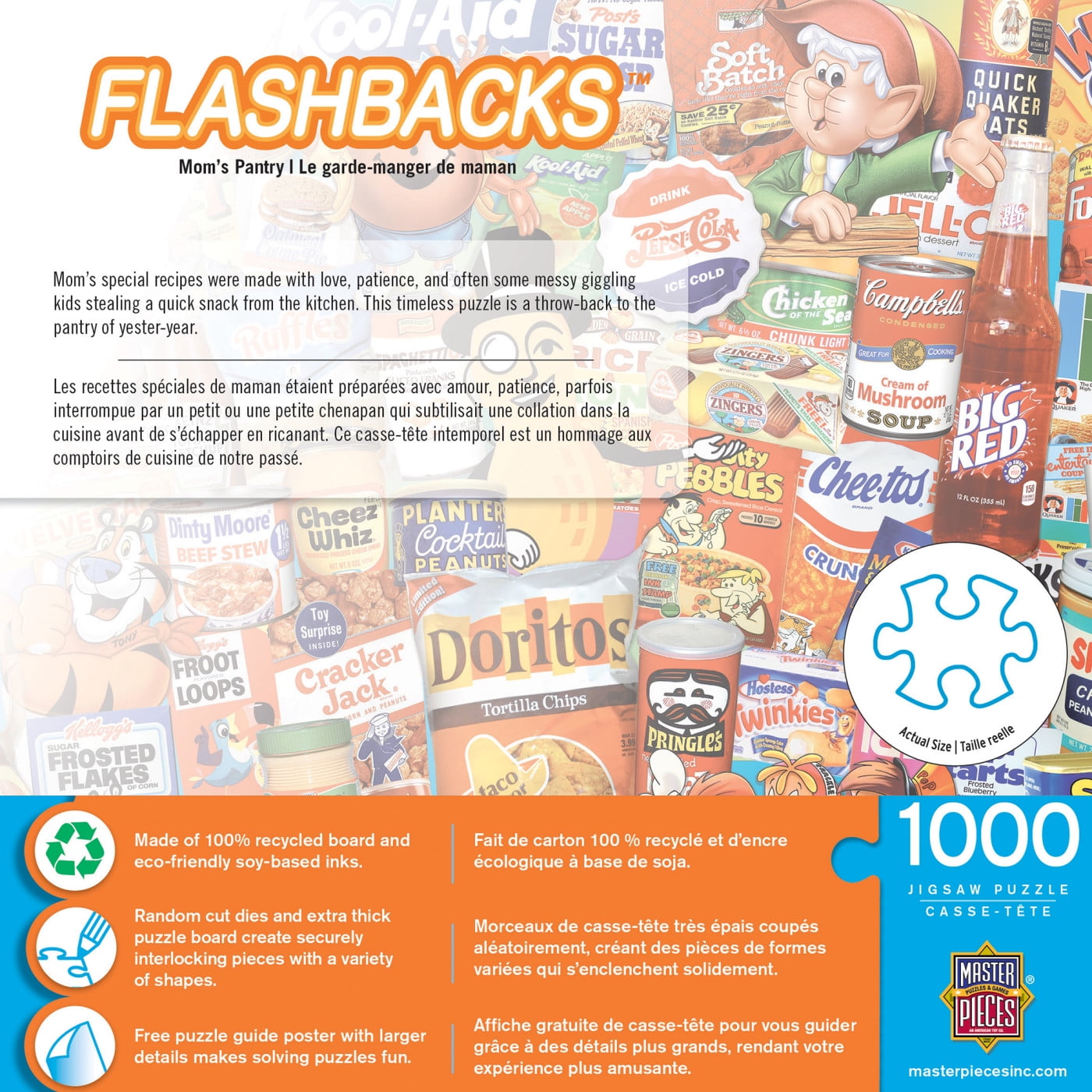 This MasterPieces 19.25" x 26.75" 1000pc Flashbacks Puzzle has a nostalgic feeling of different thinks that take you back to your childhood days. These images include classic retro board games, tin toys, gas station signs, and favorite foods from mom’s pantry. These timeless puzzles are a throw-back to yester-year. This puzzle has a matte finish. To reduce their impact on our environment, the chipboard used in these puzzles is made of recycled material.