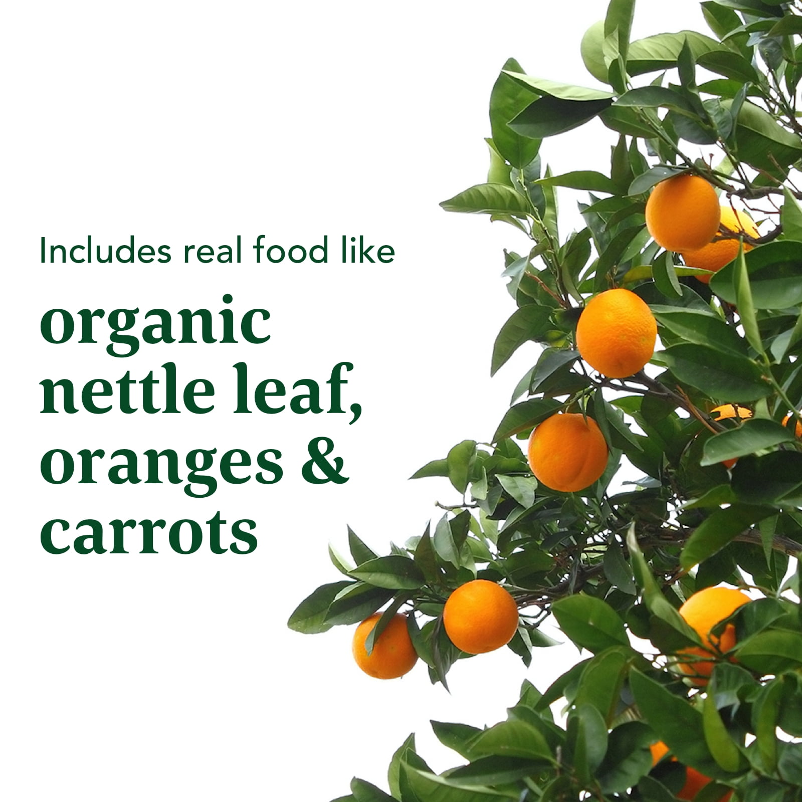 - Strengthens And Nourishes: Contains vitamins A, C, E and B6, biotin, zinc and selenium, and carrots, organic oranges, organic nettle leaf and organic brown rice