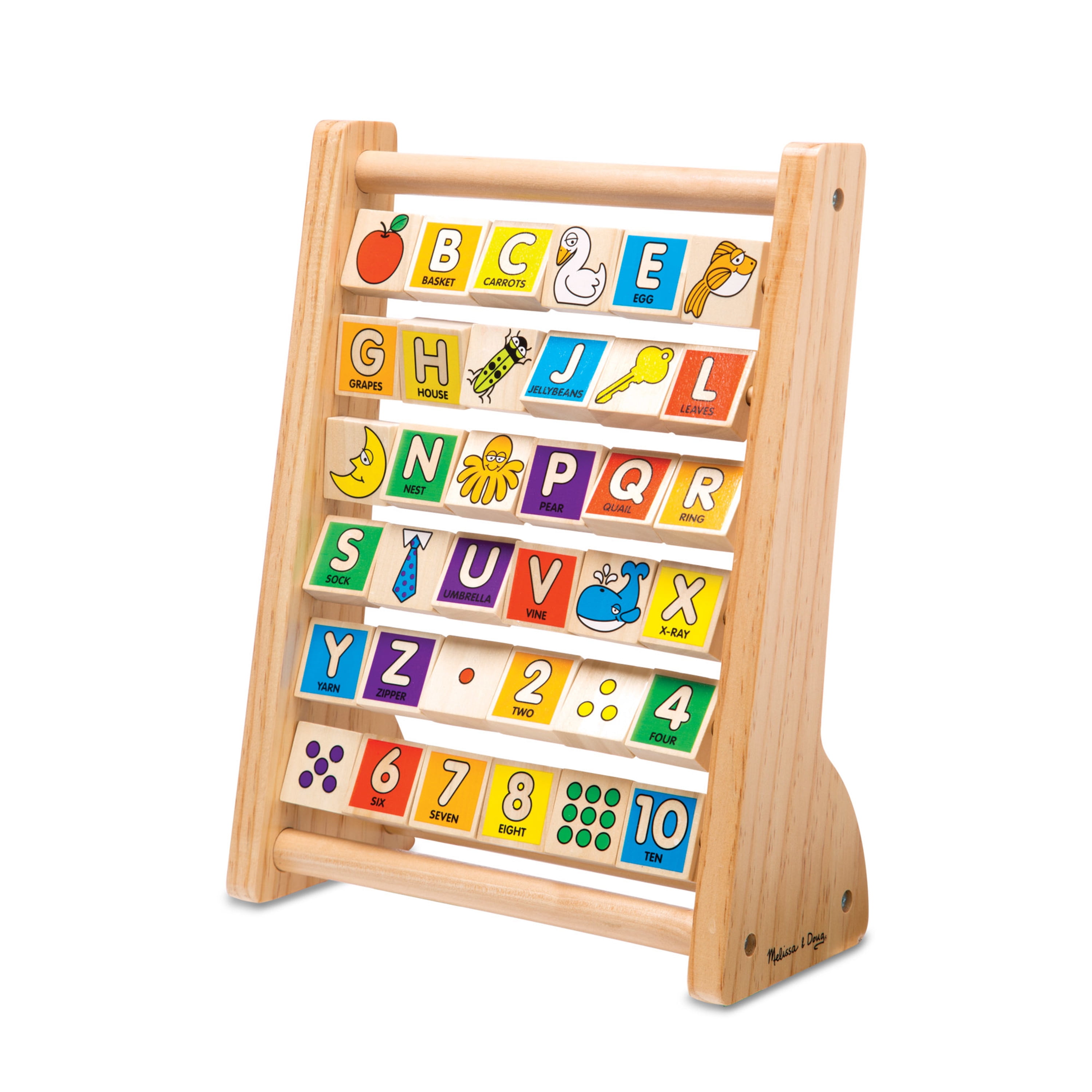 This timeless toy, featuring 36 colorful double-sided tiles, is an early-learning essential! The wooden frame includes all the letters of the alphabet as well as the numbers 1 through 10 on one side and whimsical illustrations including an apple, fish, key, moon, grapes, tie, and house on the other. The spinning tiles encourage children to play, explore, and learn. A tremendous value that will last for years!