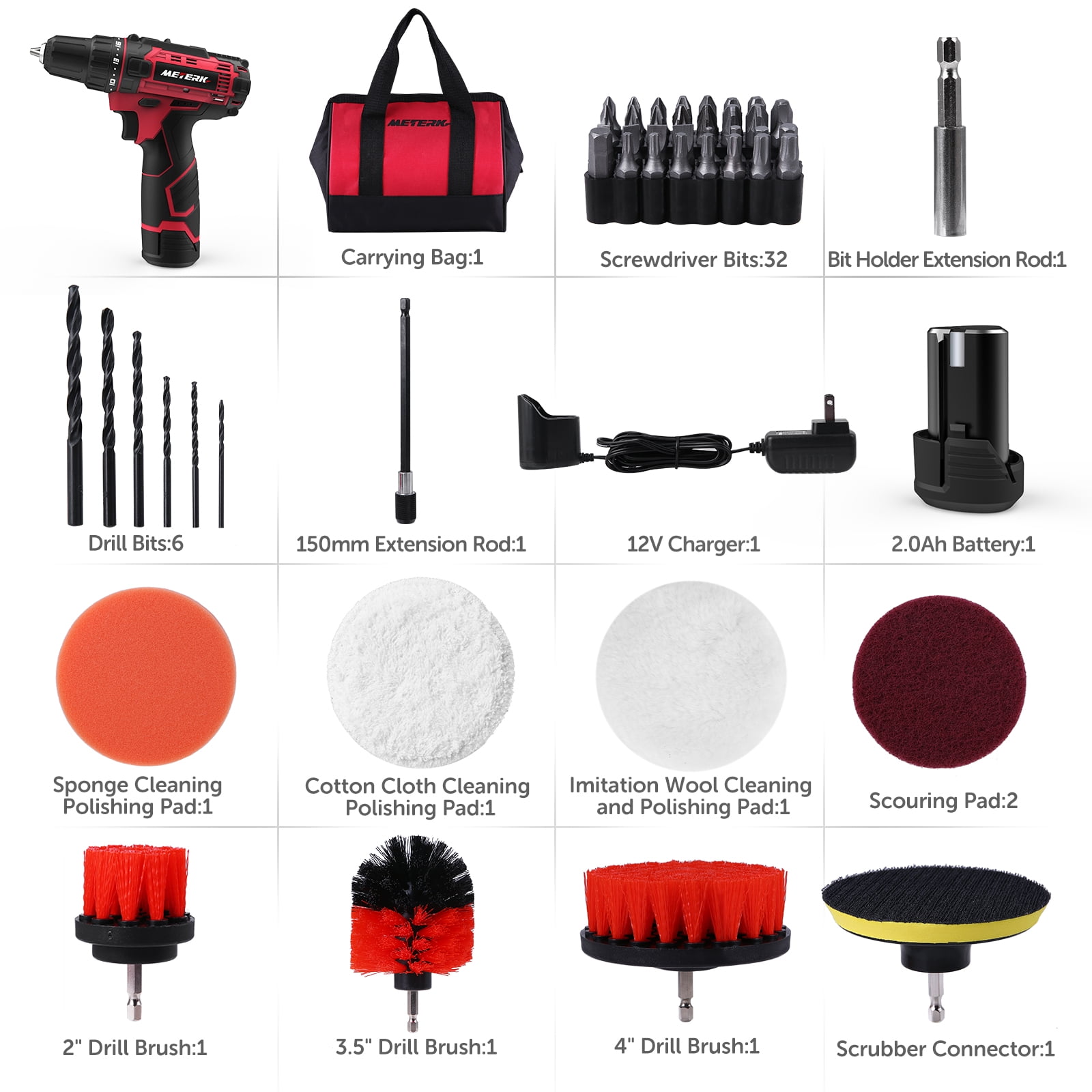 - 48+ Premium Accessories: Get your METERK power tools and let us prepare any accessories you need, each 12V Drill/Driver Combo comes with 3-Drill Brush, in conjunction with the hammer drill can easily remove and clean stains, 3-Brad Point Drill Bits, 6-Twist Drill Bits, 33-Screwdriver Bits, 1-Carrying Bag, 1-Fast Charger, 1-Battery, and 1-Tape Measure.