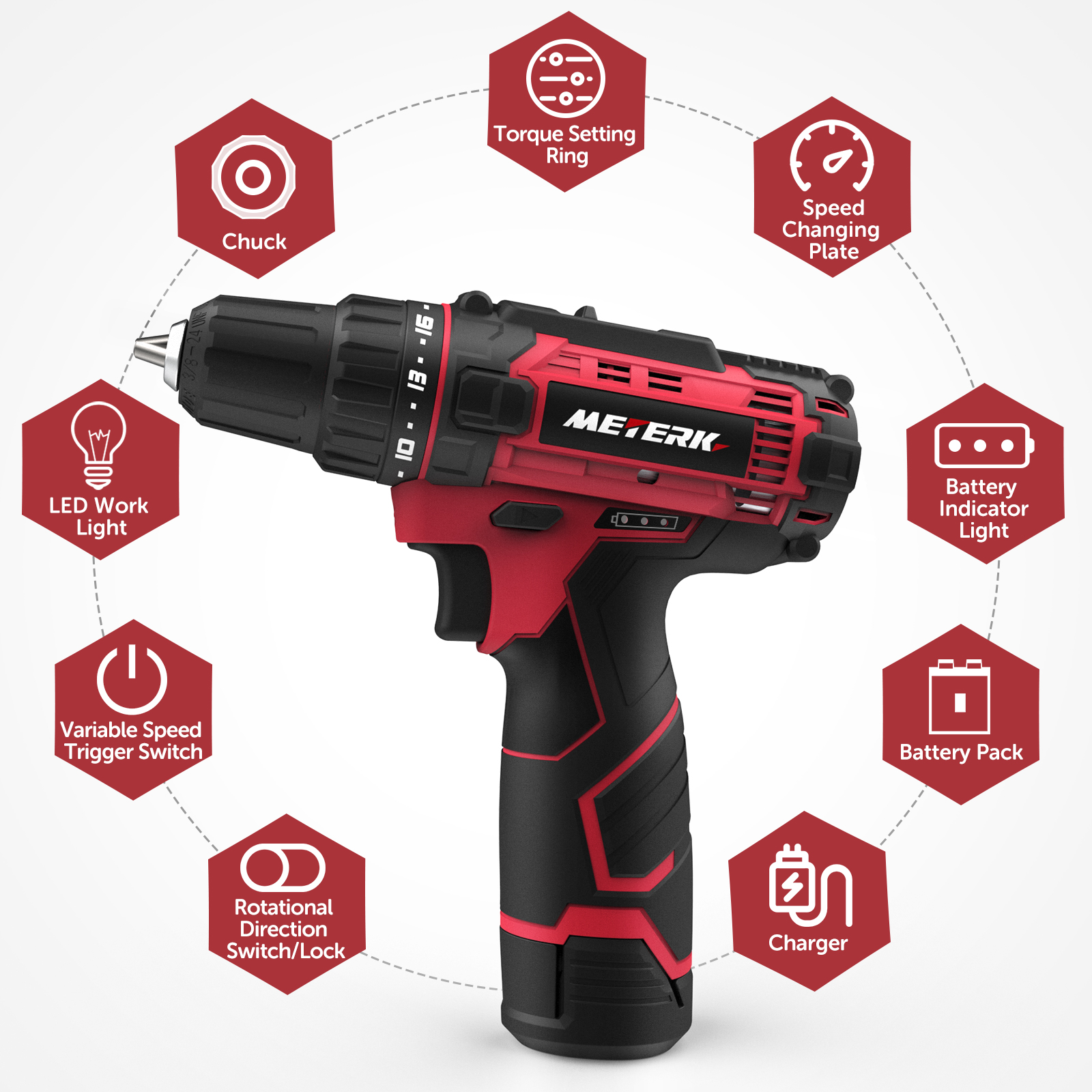 - 18+1 Clutch, 2-Variable Speed& 280In-lb Torque: Equipped with 2 in 1 working mode – driving and drilling, METERK 12V Drill/Driver is your good partner to work around. 18 adjustable clutch settings with variable pressure trigger (2-speed: 0-350RPM,0-1350RPM) help complete a wide range of applications precisely. No matter it is household reconstruction, improvements, DIY handcrafts, or auto repairs, consider METERK drill as a you CANNOT MISS everyday drill/driver.