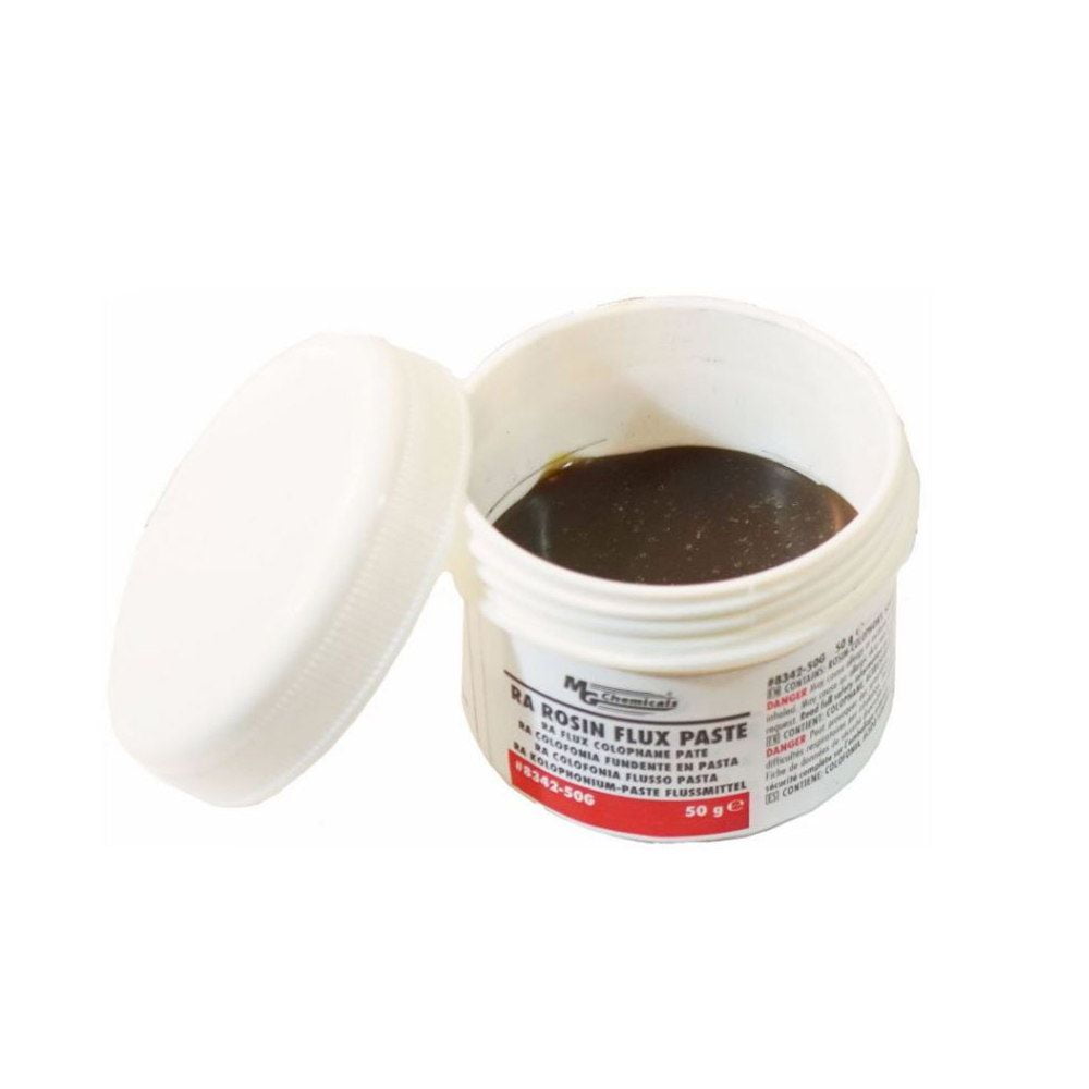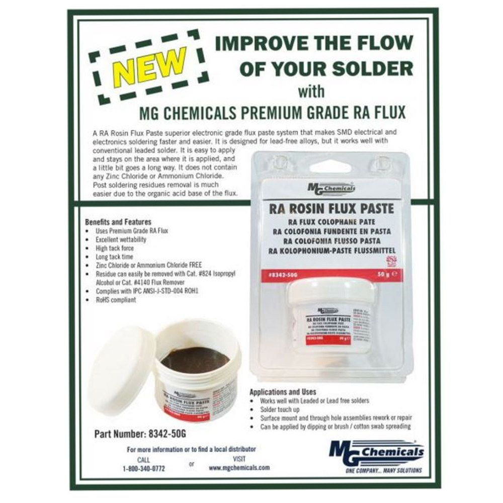 8342 RA Rosin Flux Paste superior electronic grade flux paste system that makes SMD electrical and electronics soldering faster and easier. It is designed for lead-free alloys, but it works well with conventional leaded solder. It is easy to apply and stays on the area where it is applied, and a little bit goes a long way. It does not contain any Zinc Chloride or Ammonium Chloride. Post soldering residues removal is much easier due to the organic acid base of the flux.