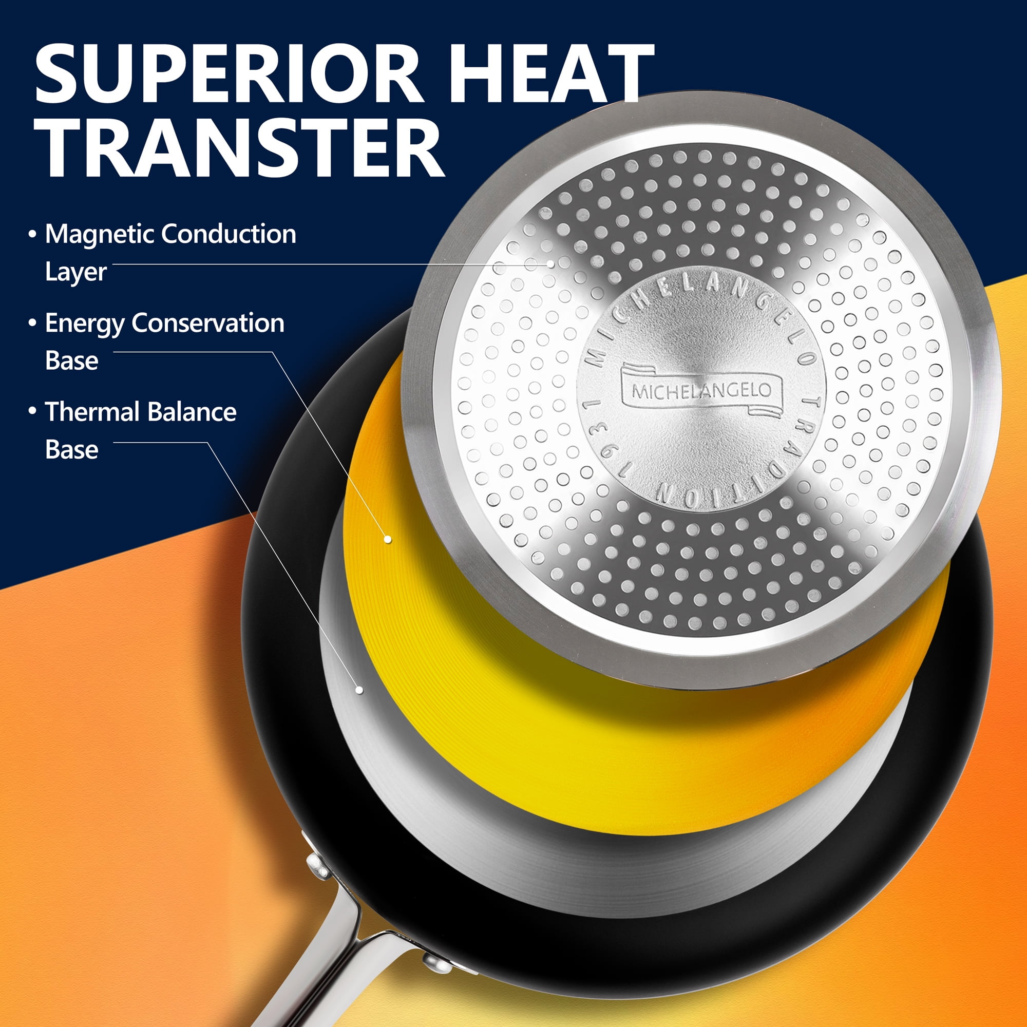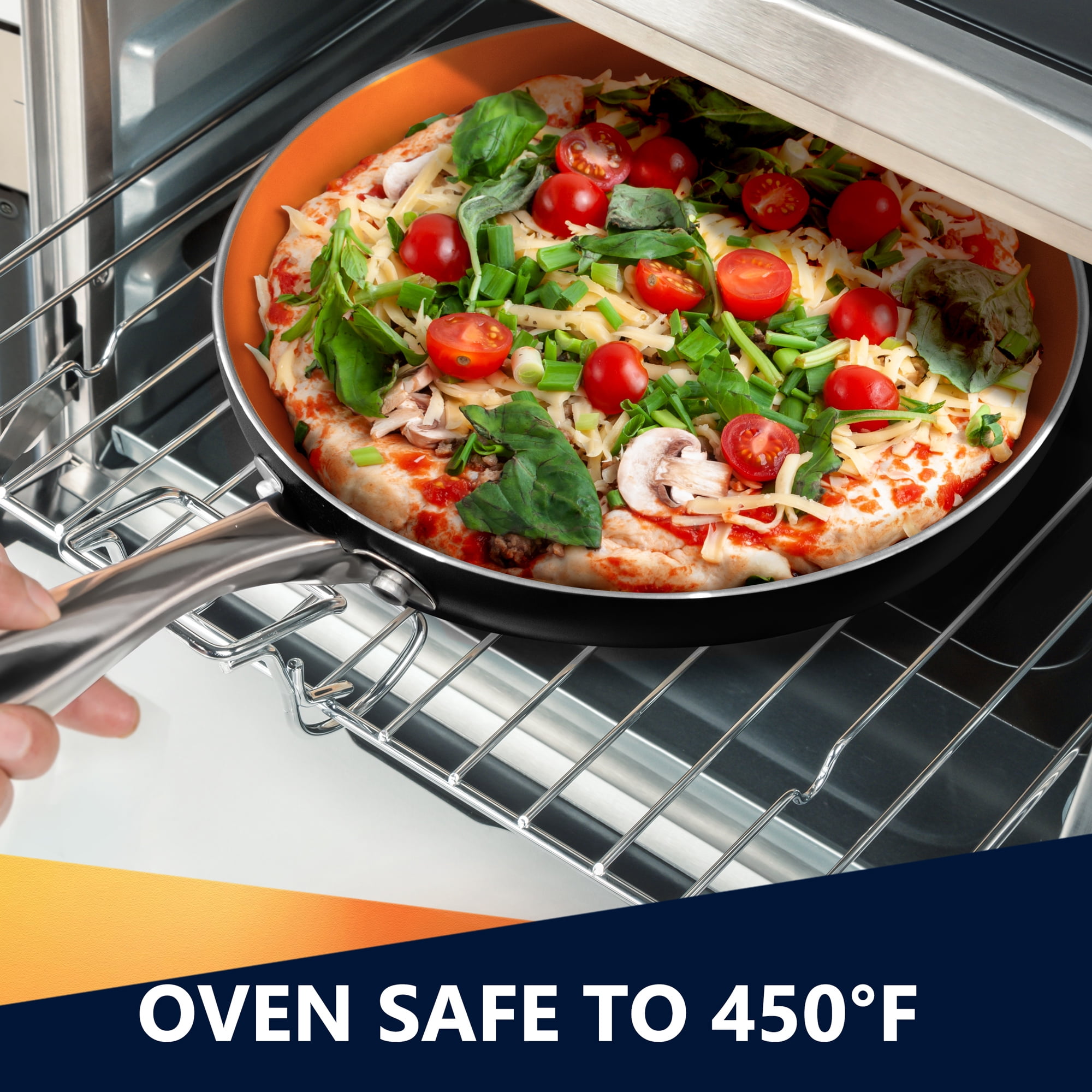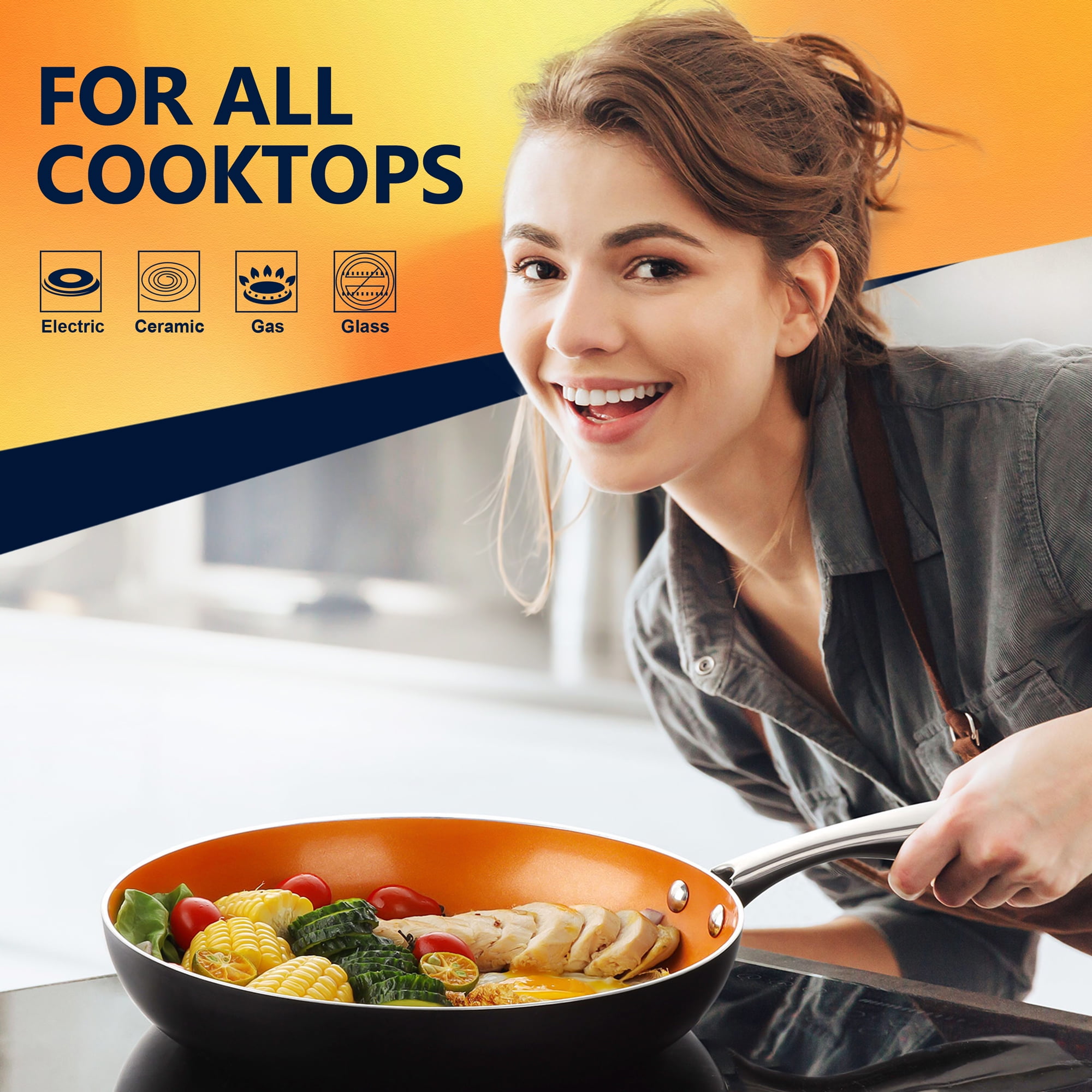 MULTIPLE LAYER NON STICK COATING – The superior Ceramic & Titanium interior of this nonstick skillet is ultra-nonstick and scratch resistant that enhances both durability and cooking performance. HEATS QUICKLY & EVENLY – Made of professional grade aluminum alloy that conducts heat quickly and evenly with precise temperature control and no hot spot. The copper frying pan is designed for professional multiple cooking use and allows you fry up your favorite breakfast, eggs, veggies, meats and more with less oil for healthy diet. CONVENIENT DESIGNED – The frying pan is specially designed with a long stainless steel handle that is nice to grip, easy to maneuver. The hanging loop of the 11 inch frying pan is for convenient for storage. OVEN TO STOVE VERSATILITY – The nonstick frying pan is made with a flat bottom which allows it to be placed evenly heat source and suitable for use on all stove tops except induction. Oven safe up to 450°F. NON TOXIC – PTFA, PFOA, lead and cadmium free, ideal for healthy cooking. Choose Michelangelo Titanium Frying Pan for greener and safer cooking. Package Includes: 1 x 11 Inch Copper Frying Pan NonstickMULTIPLE LAYER NON STICK COATING – The superior Ceramic & Titanium interior of this nonstick skillet is ultra-nonstick and scratch resistant that enhances both durability and cooking performance. HEATS QUICKLY & EVENLY – Made of professional grade aluminum alloy that conducts heat quickly and evenly